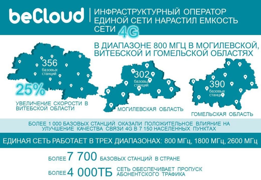В конце февраля на 356 базовых станциях Витебской области радиочастотный канал в диапазоне 800 МГц расширили на 10 МГц. Это удвоило суммарный объём радиочастотного спектра. Пропускная способность LTE выросла на 56,8%, а средняя скорость передачи данных увеличилась примерно в 1,8 раза — до 21 Мбит/с.