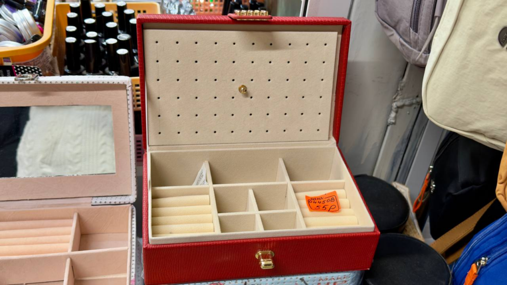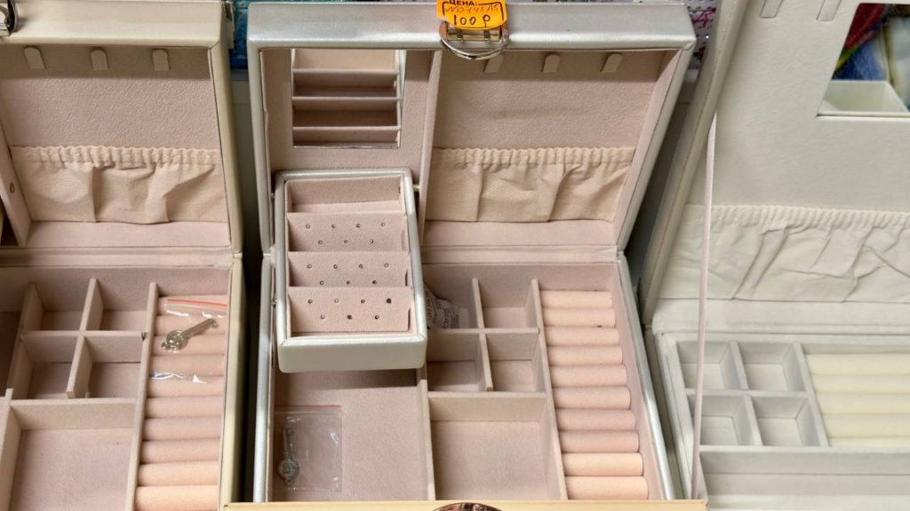 Коробки с отсеками для украшений стоят примерно от 55 до 100 рублей, в зависимости от размера и функционала, в некоторых есть даже встроенные зеркала. Это удобный способ хранить кольца, серьги и цепочки в одном месте, кроме того, шкатулка может служить элементом декора.