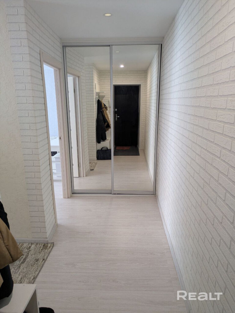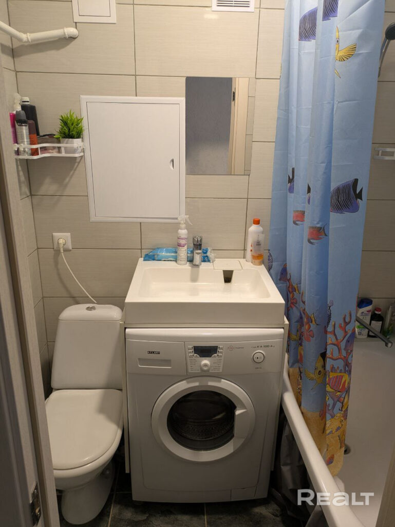 Санузел совмещенный, ванная и унитах разделены между собой стиральной машиной. В прихожей стоит зеркальный шкаф-купе для хранения вещей.