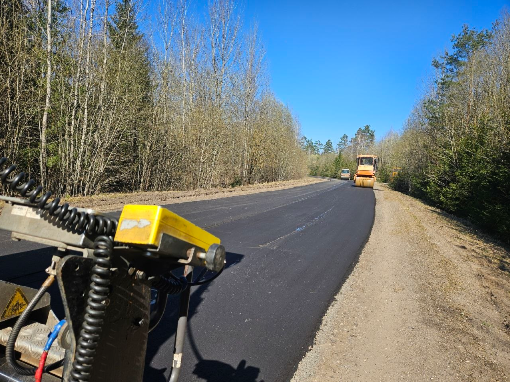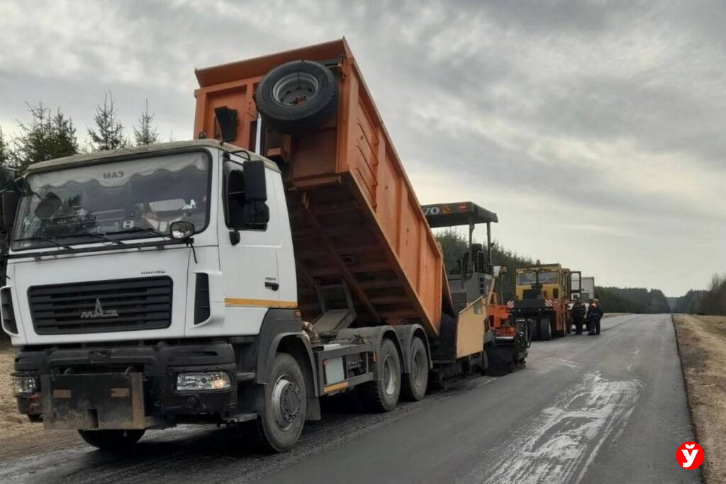 ДРСУ №195 укладывает новый асфальт на автодороге Н-9091 Молодечно — Хожово — Ермаки.