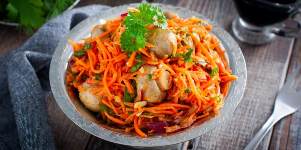 Здесь вступает в игру восточная нота. Грибы маринуются быстро, но аромат получается глубоким — за счет укропа, чеснока и душистого перца. Готовая корейская морковь дает нужную остроту и хруст. Салат хорош как закуска к крепким напиткам или как легкий ужин.