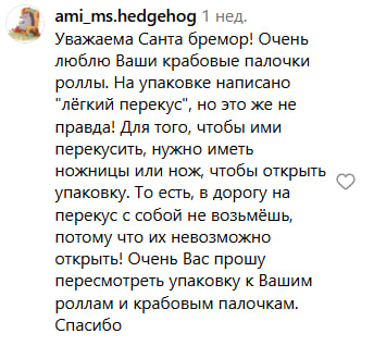 В Instagram компании одна из покупательниц обратилась с открытым обращением: «Очень люблю Ваши крабовые палочки роллы. На упаковке написано «лёгкий перекус», но это же не правда! Для того, чтобы ими перекусить, нужно иметь ножницы или нож. В дорогу на перекус с собой не возьмёшь, потому что их невозможно открыть!»