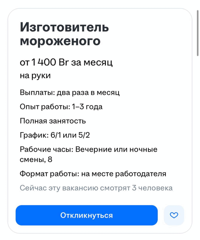 Изготовителя мороженого с зарплатой от 1400 рублей ищут на производство в Борисове. В списке требований – наличие санитарной книжки (выдают направление и оплачивают); опыт работы на производстве в пищевой отрасли; аккуратность, ответственность, добросовестность; желание работать.