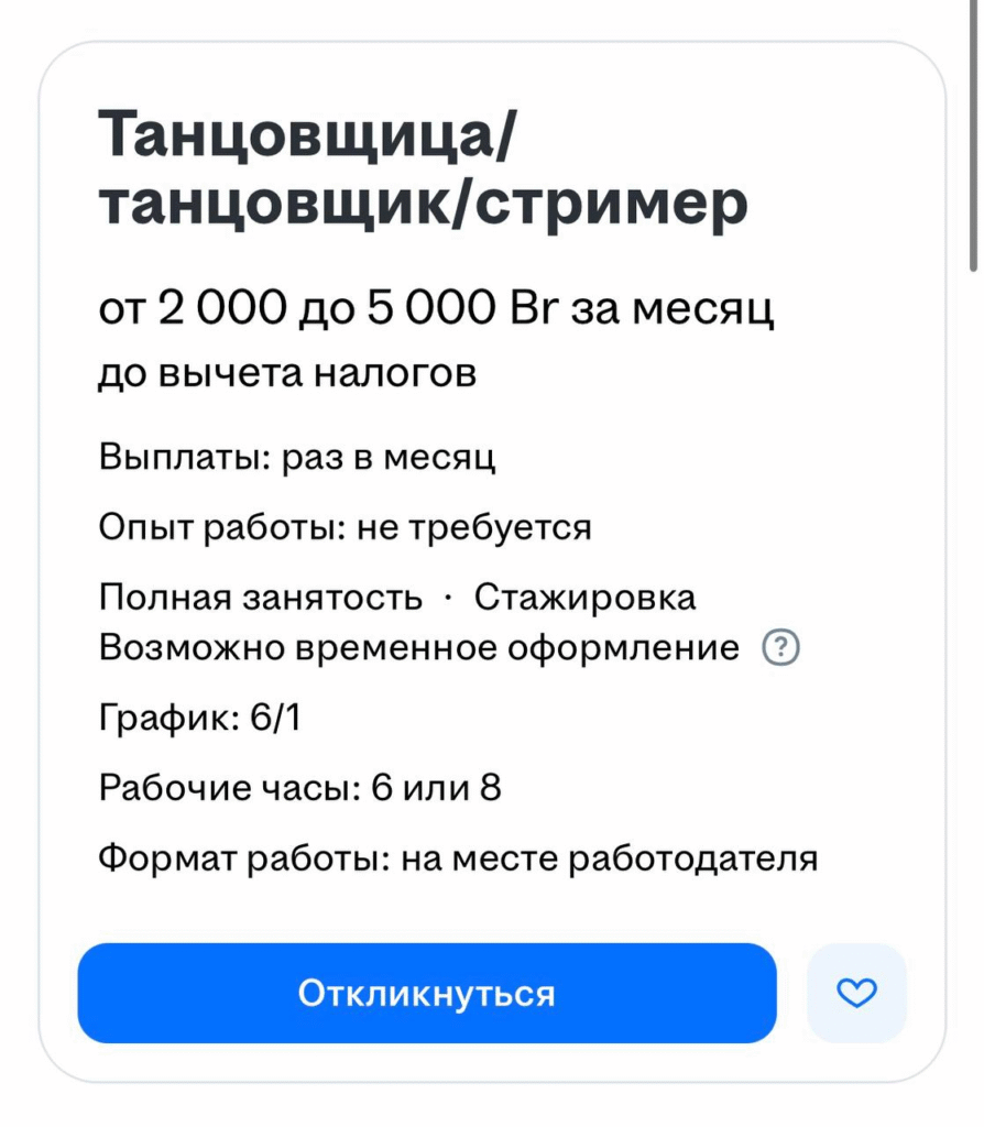 ООО «Шицзы Вэньхуа» ищет сотрудников на должность стримеров-танцовщиц для проведения прямых эфиров в TikTok. Зарплату обещают от 2 000 до 5 000 рублей за месяц до вычета налогов.