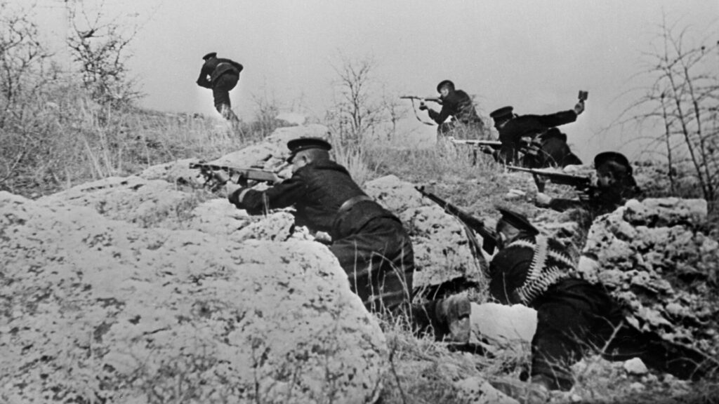 — Полезли адольфы! — крикнул один из моряков и метнул гранату туда, где тыкал рукой в нашу сторону длинноногий офицер. Взвизгнули рядом пули. В воздухе поплыла кислятина от взрывов гранат…Перед нашими окопами осталось валяться несколько вражеских трупов, ранцы из телячьей кожи, противогазы в гофрированных пеналах, исковерканные каски.