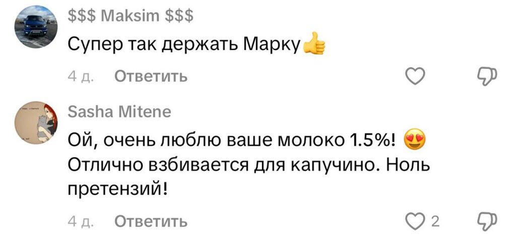 - «Естественно, ультрастеризованное молоко после вскрытия не хранится. И не сквашивается, потому что после ультрастеризации сквашиваться нечему. Обожаю именно это молоко, очень хорошо взбивается для капучино. Ой, очень люблю ваше молоко 1.5%! Ноль претензий!»