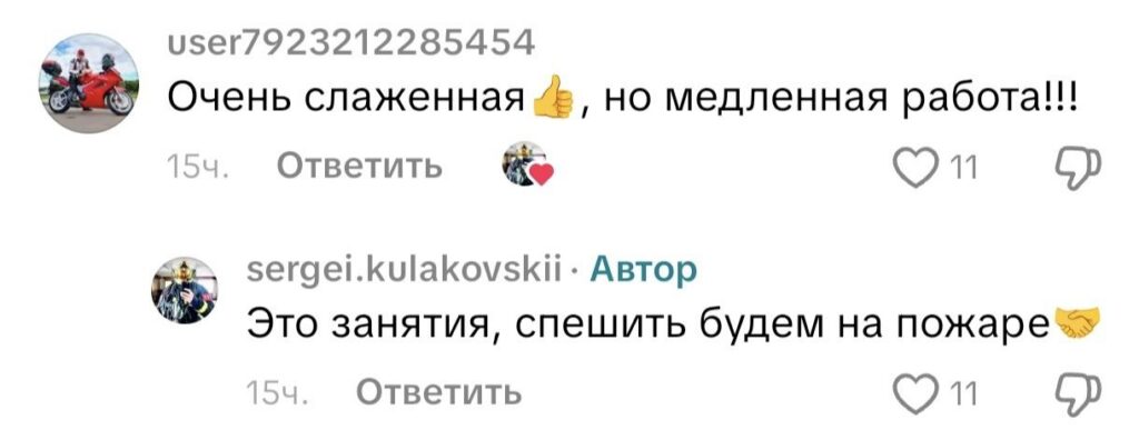 Увы, но наши люди любят комментировать чужую работу, не разбираясь в ней и не понимая основ. Вот, например, один из пользователей написал: «Очень слаженная, но медленная работа». С одной стороны, похвалили, но, с другой, нашел за что упрекнуть. Безусловно, в экстремальных случаях, действовать нужно быстро, четко. Однако, это учения и все-таки профессионалам виднее, на какой скорости перемещаться. Кстати, комментатору ответил автор: «Это занятия, спешить будем на пожаре». Вполне достойный ответ.