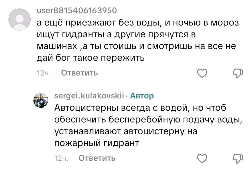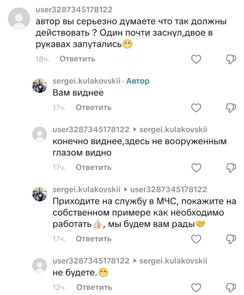 А самым, пожалуй, смешным оказался комментарий анонима. «Автор, вы серьезно думаете, что так должны действовать? (сотрудники МЧС. — Прим. «МП»). Один почти заснул, двое в рукавах запутались». На самом деле, я не заметил того, о чем писал тиктокер. Конечно, каждый видит по-своему. Но самым лучшим способом показать правильность действий, пожалуй, будет личный пример, который каждый из комментаторов сможет показать. Хочется верить, что у этих людей никогда и ничего не будет общего с пожарными. И встретиться они смогут только на просторах TikTok.