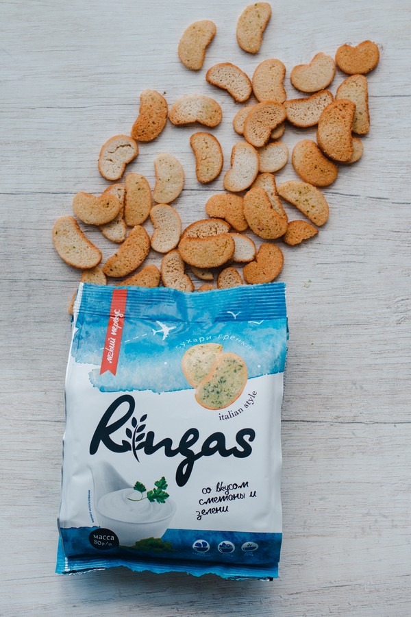 Отдельная глава в истории предприятия – снэковая продукция, а именно сухарики Ringas. Их отличает щадящая технология без обжарки во фритюре. Сухарную плиту выпекают, тонко нарезают, сушат и посыпают добавками. Получается хрустящий перекус со вкусом сыра, сметаны с зеленью или белых грибов, который может стать и пикантной добавкой к салату.