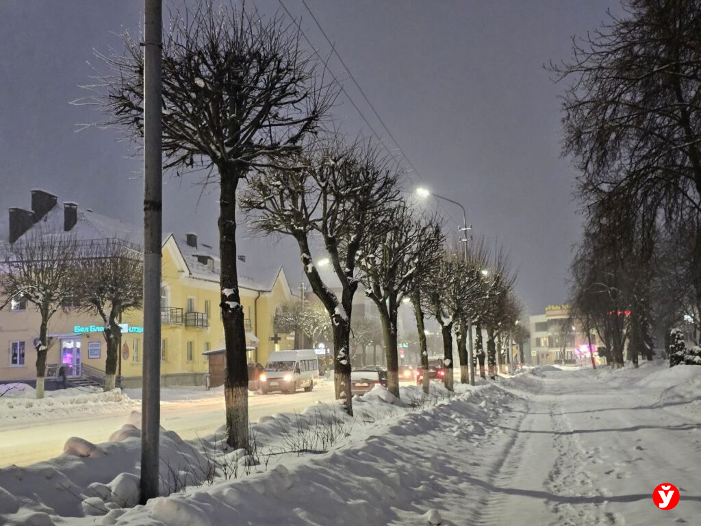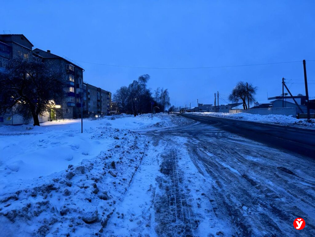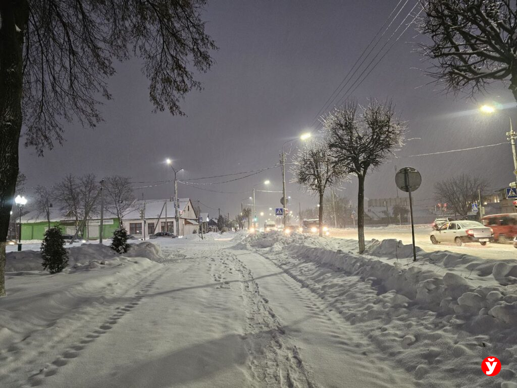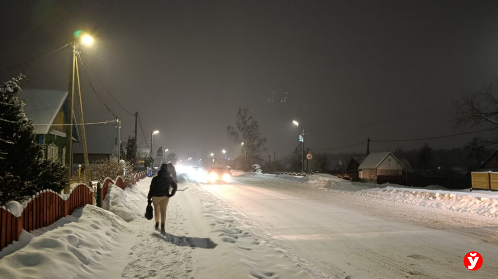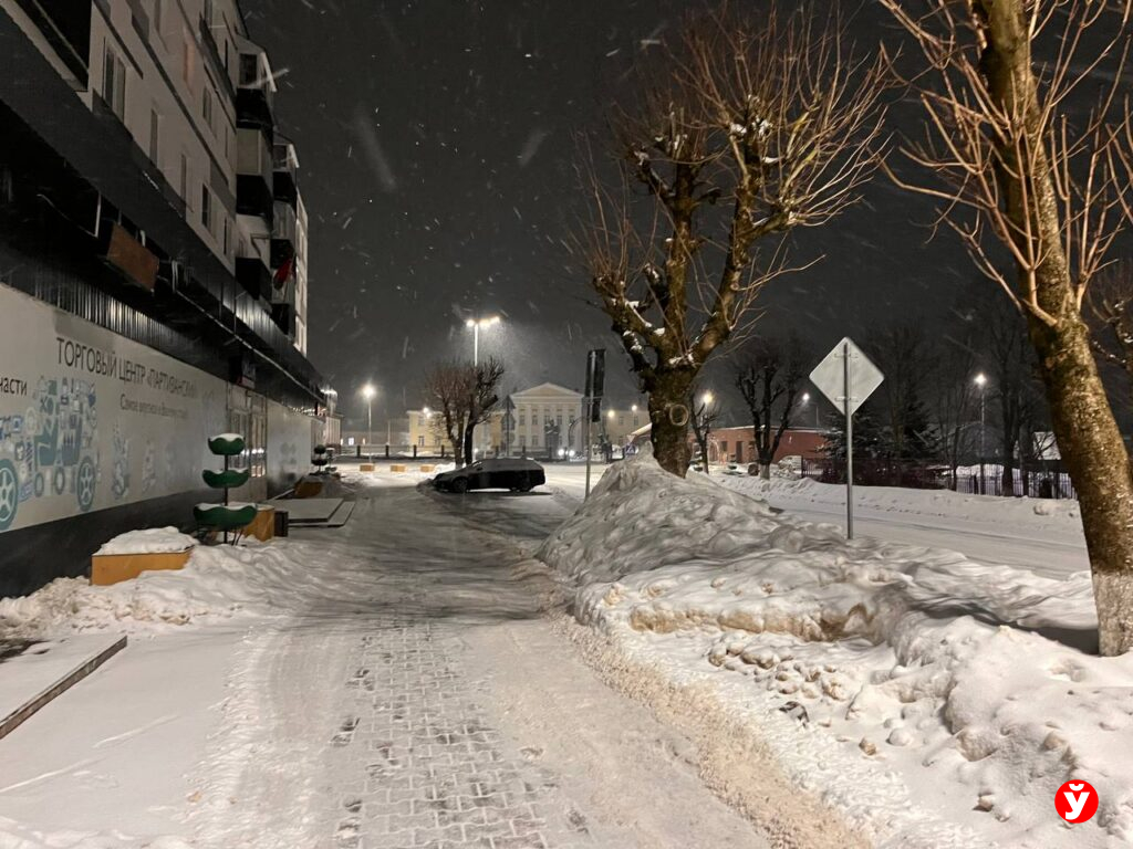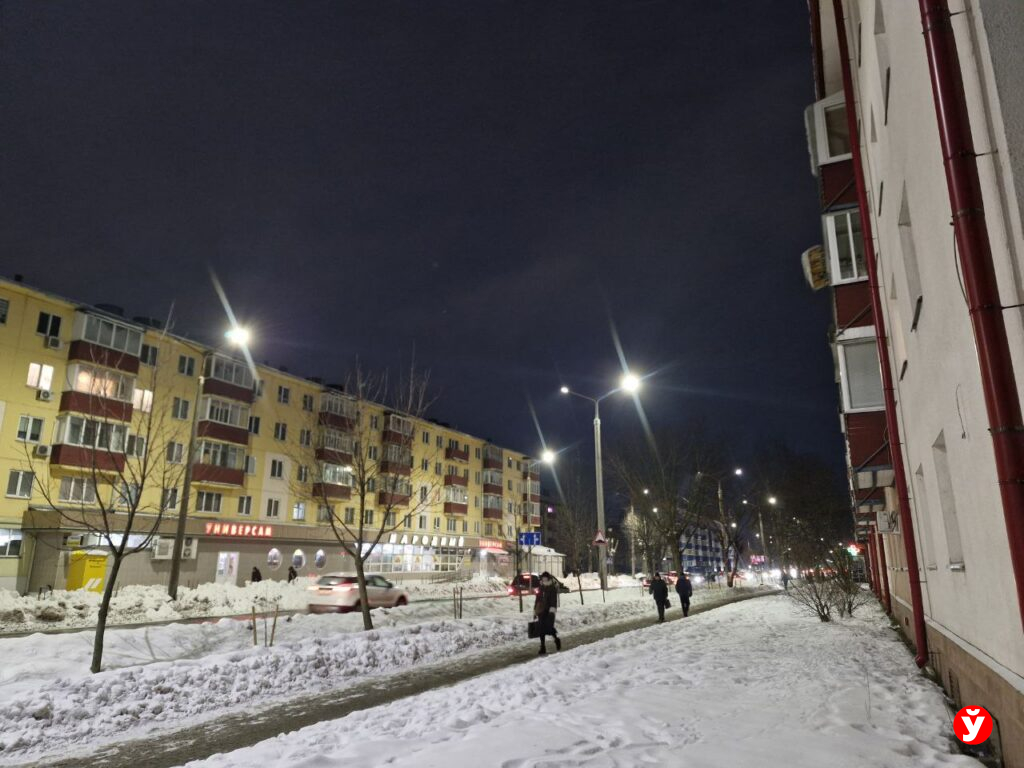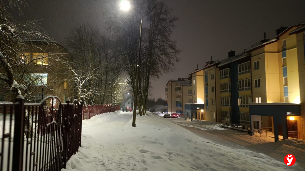 В Смолевичах утром 5 февраля чуть раньше отключили фонари, но освещения достаточно от фар машин, фонарей над подъездами и снега.
