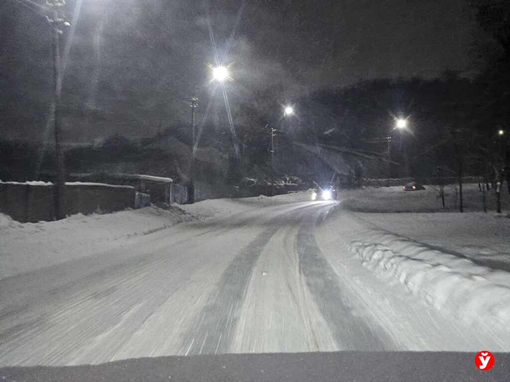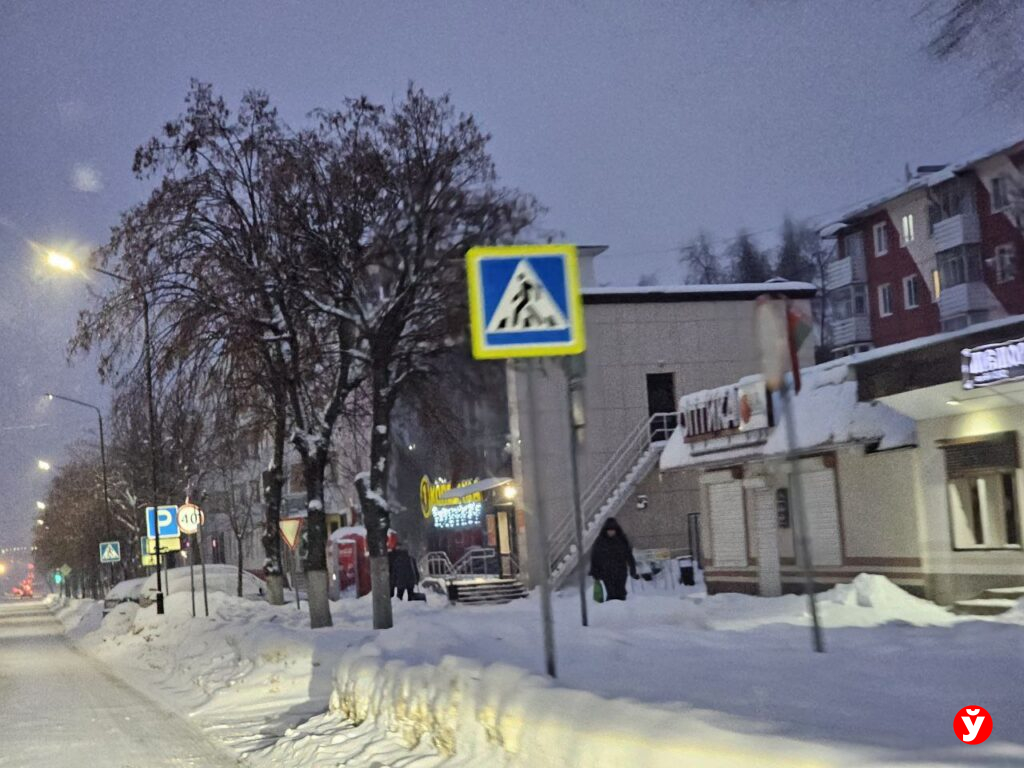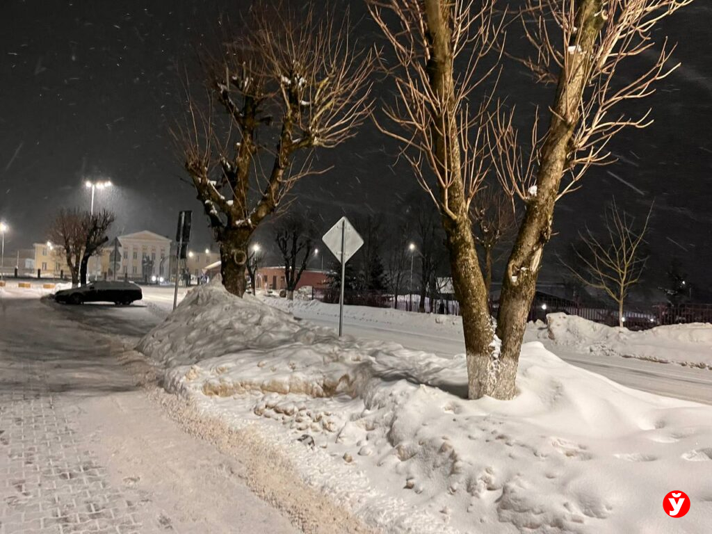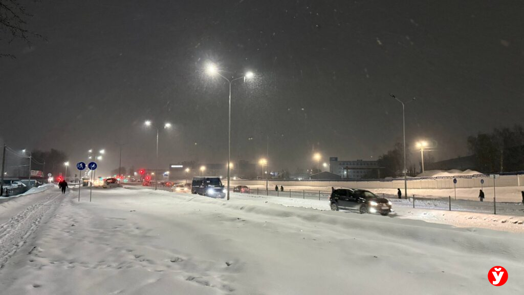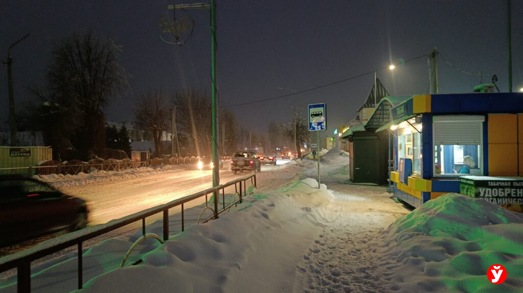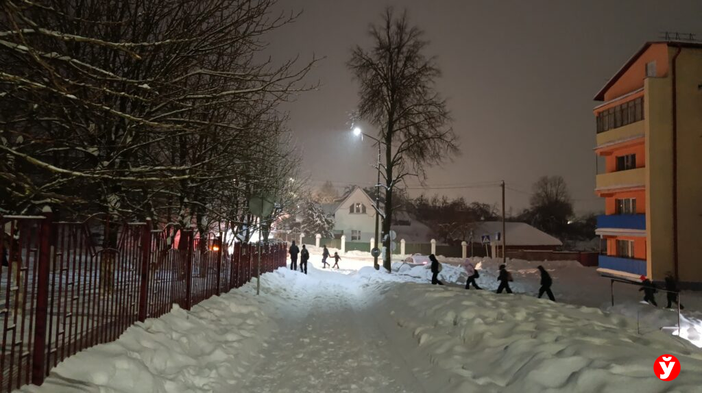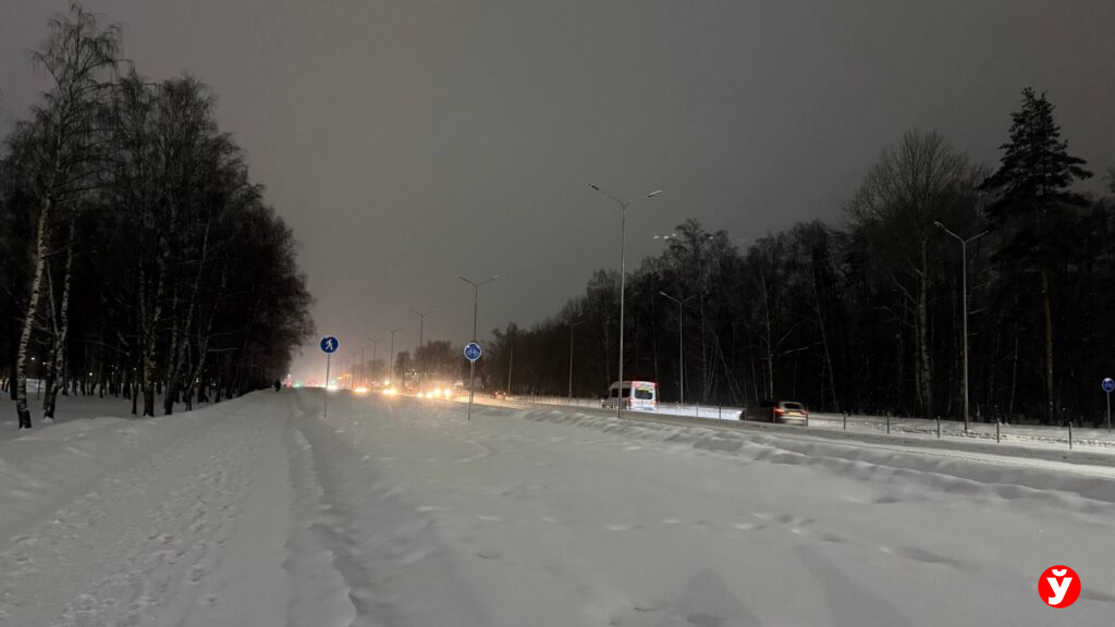 В Смолевичах утром 5 февраля чуть раньше отключили фонари, но освещения достаточно от фар машин, фонарей над подъездами и снега.