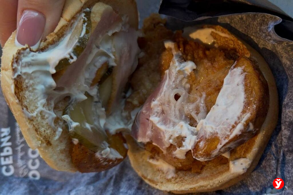 Следующей позицией стал «Дабл Чыкен па-беларуску». Внутри — бекон, солёные огурцы, сыр и грибной соус. Главная особенность — вместо булочки используются два крупных куриных филе в панировке.