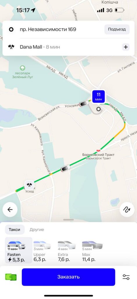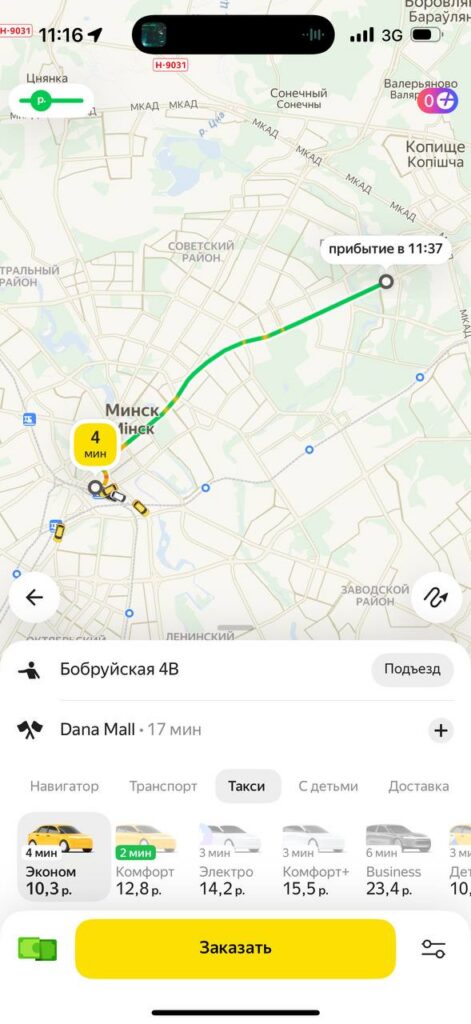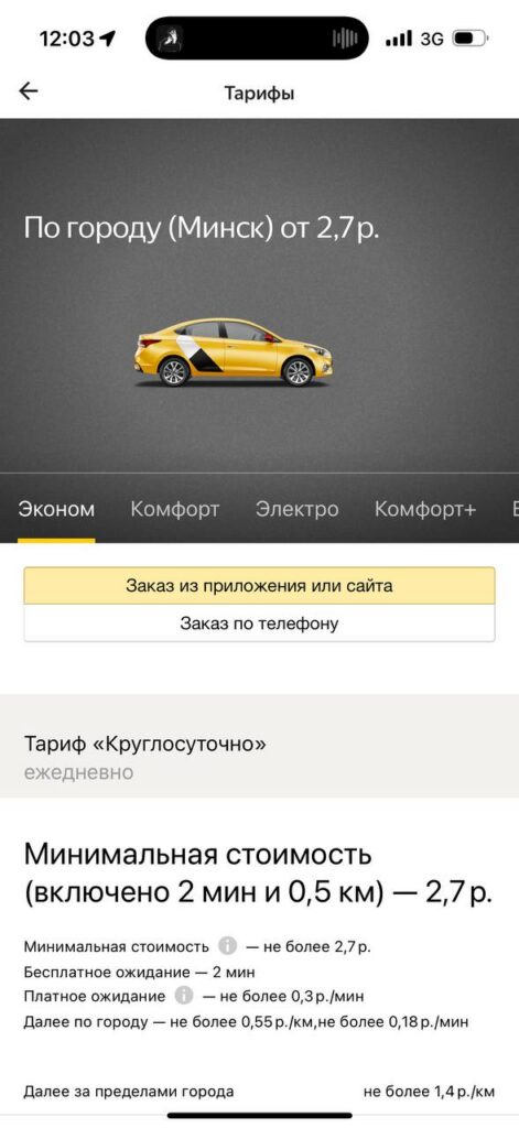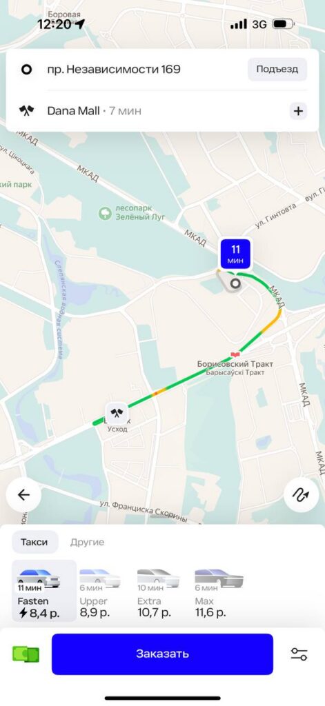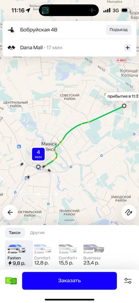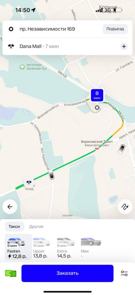 В приложении «Яндекс Go» стоимость тарифа «Эконом» в Минске начинается от 2,7 рубля, в нее включено такое же время в пути и километраж, как у Fasten. Разница в 13 копеек не критичная, но все же есть. Каждый последующий километр обойдется не более чем в 0,55 рублей, минута пути – не более чем в 0,18 рублей.