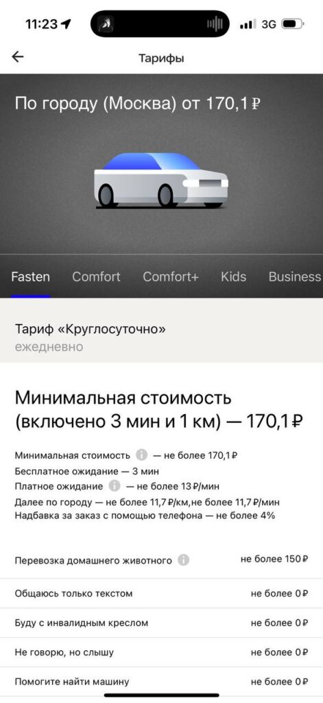 В России Fasten предлагает такую линейку тарифов: Share (поездки с попутчиком), Fasten (базовый), Comfort, Comfort+, Business, а также отдельный детский тариф Kids. Как и в Беларуси, сервис позволяет заказывать машину для поездок с животными, багажом и для людей с ограниченными возможностями. При этом подписка «Яндекс Плюс» в новом приложении не работает — накапливать и тратить баллы на поездки нельзя.