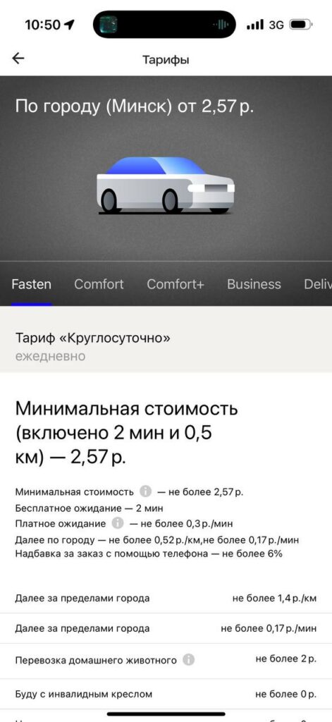 Как отмечают в приложении, цены на поездку по Минску по минимальному тарифу Fasten начинаются от 2,57 рубля. В нее включено 2 минуты и 0,5 километров. Далее по городу поездка обойдется не более чем в 0,52 рубля за 1 километр или не более 0,17 рублей за 1 минуту в дороге.