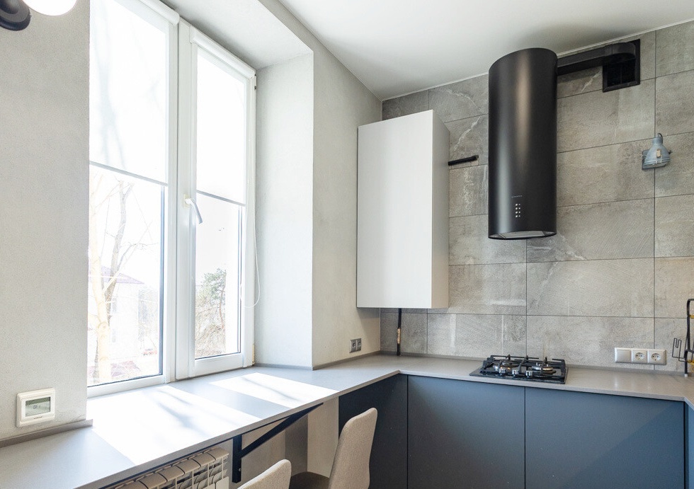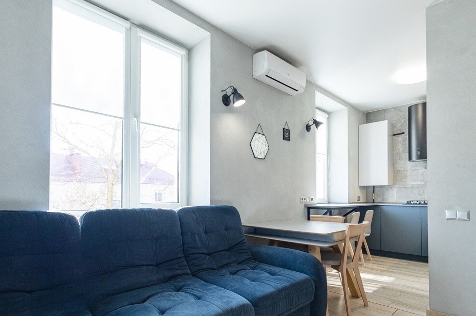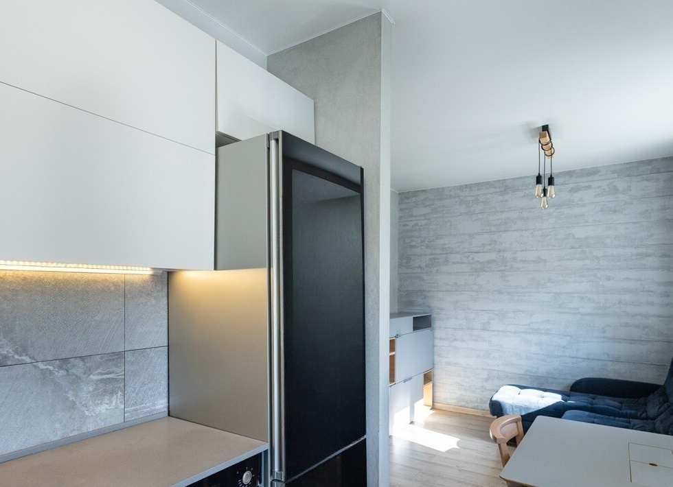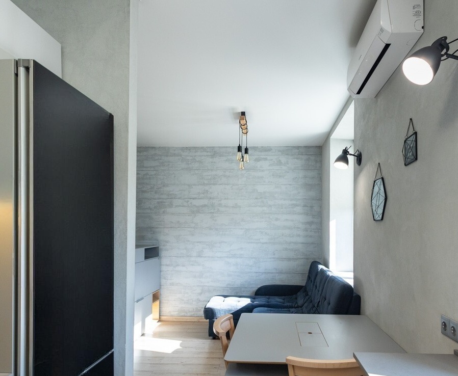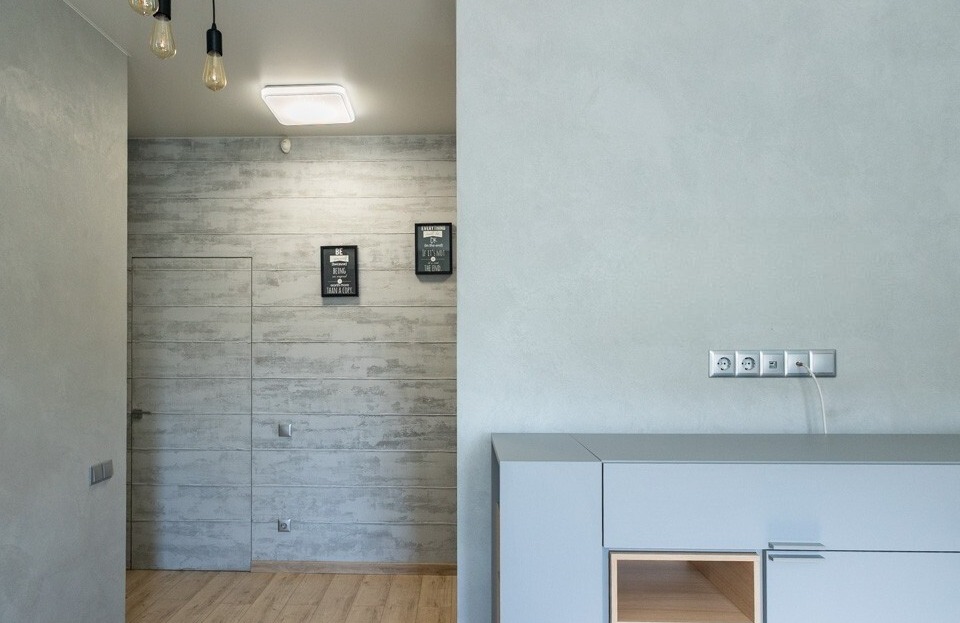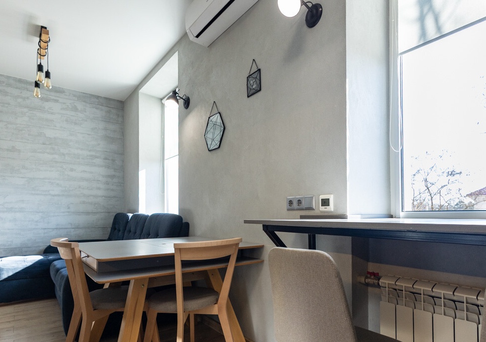 Квартира расположена на втором этаже двухэтажного сталинского дома, который был построен в 1957 году. Общая площадь жилья составляет 44,8 квадратных метра, и в ней была проведена грамотная перепланировка. Одним из самых заметных изменений стало объединение кухни и гостиной, что не только увеличило пространство, но и позволило наполнить его естественным светом.