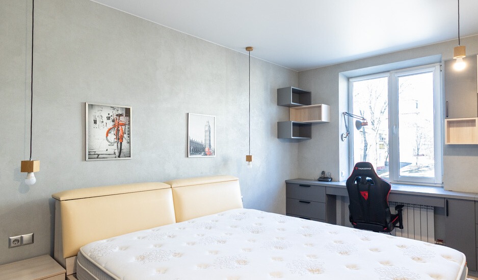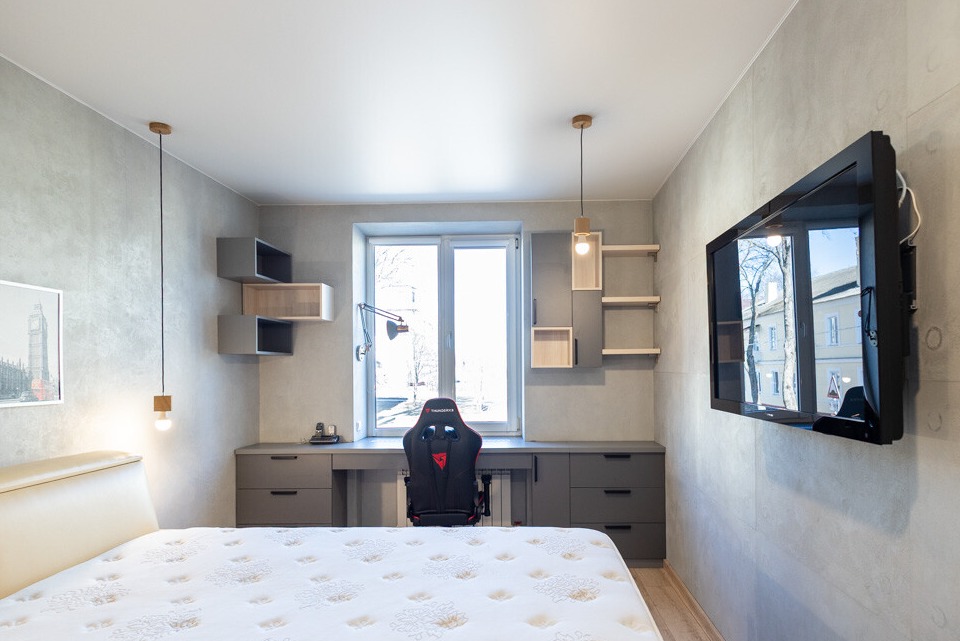 В квартире имеется изолированная комната, которая была отведена под спальню. Здесь также нашлось место для рабочего стола.