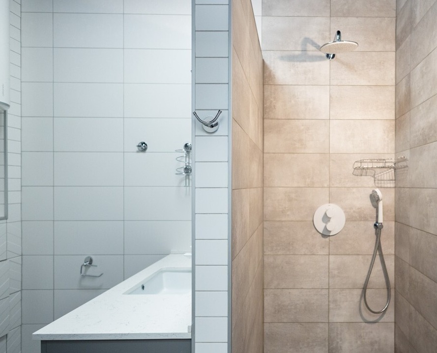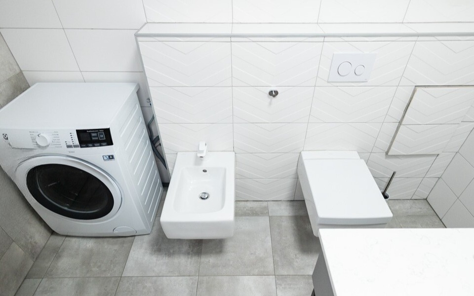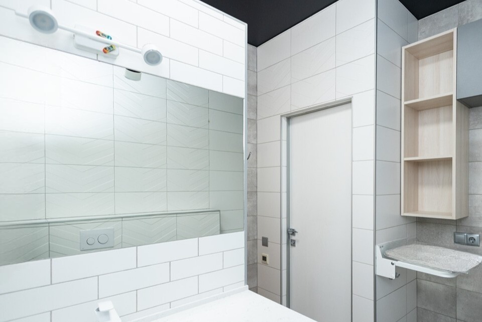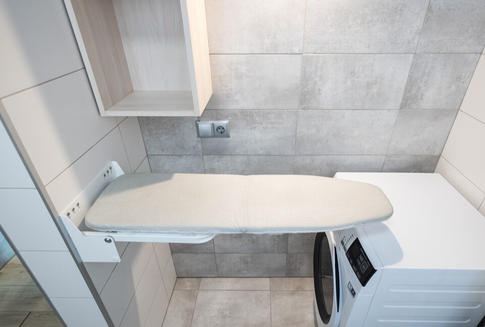 Санузел в этой евродвушке совмещенный, и его стены отделаны керамогранитом. В ванной комнате установлена импортная сантехника, а также душ. Здесь же предусмотрено место для стиральной машины. Кроме того, в санузле смонтирована гладильная доска.