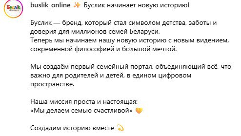«Буслик» – бренд, который стал символом детства, заботы и доверия для миллионов семей Беларуси. Теперь мы начинаем нашу новую историю с новым видением, современной философией и большой мечтой», — говорится в публикации.