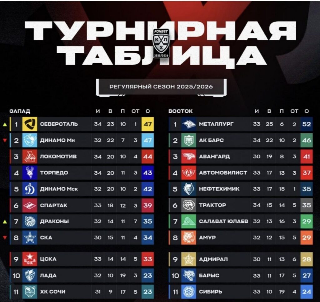 Там с хорошим перевесом лидирует «Металлург»: 52 очка и 33 встречи. На втором месте «АК Барс» — 46 баллов и 34 матча. Тройку замыкает «Авангард» — 41 пункт и 30 игр. Худшей командой значится «Сибирь»: лишь 24 очка при 33 противостояниях.
