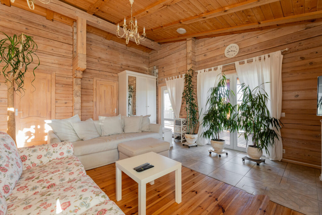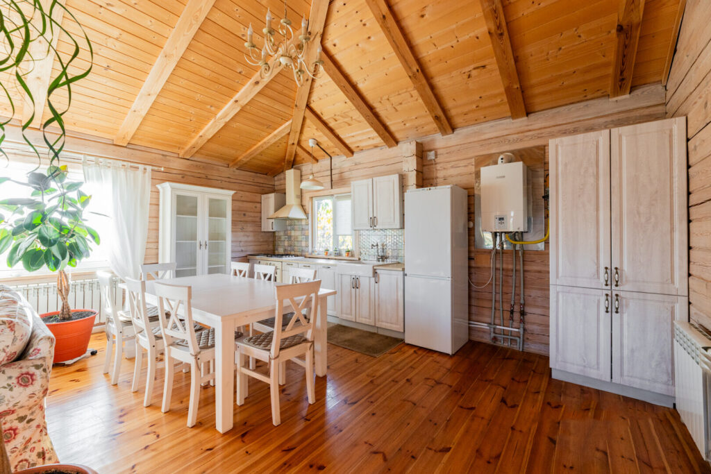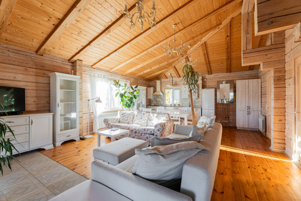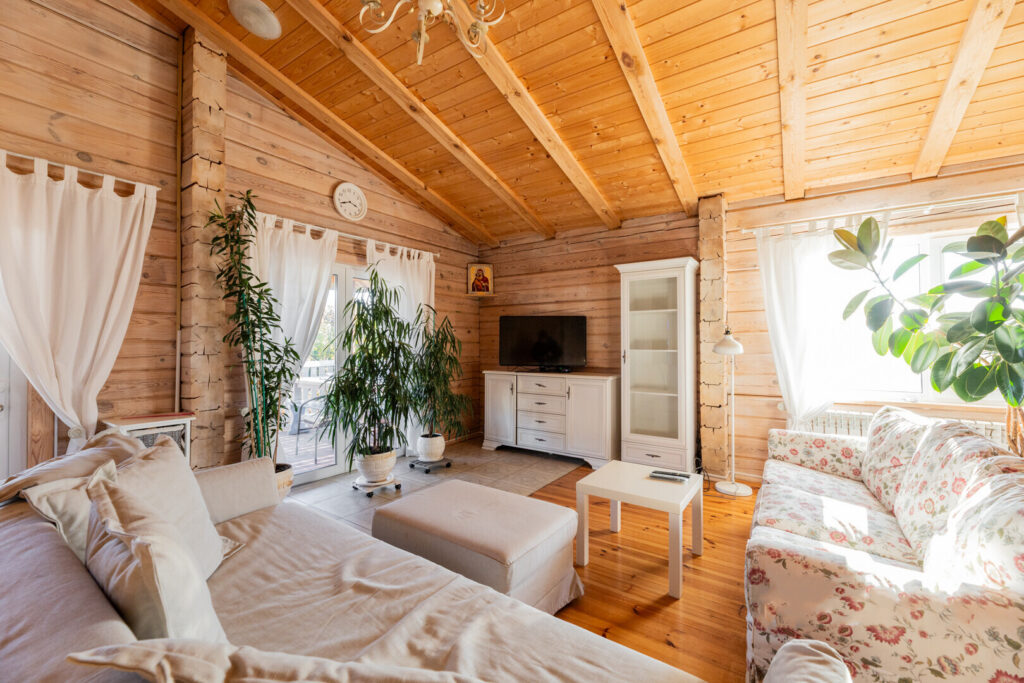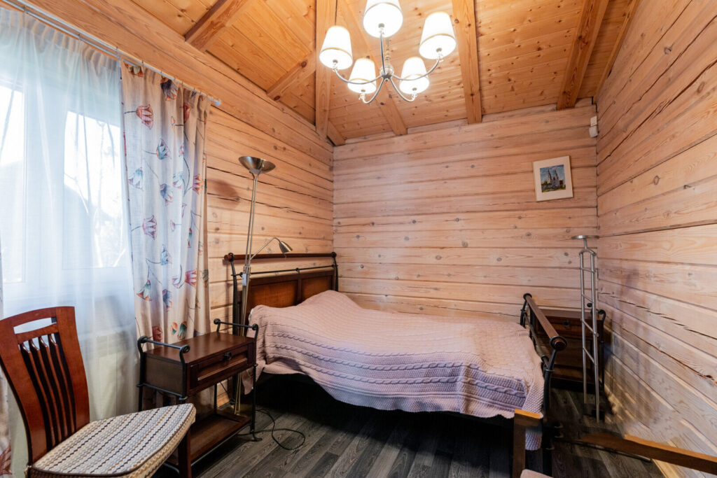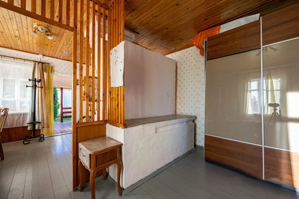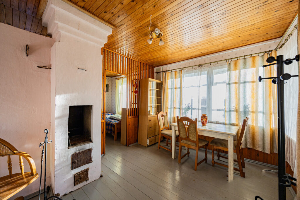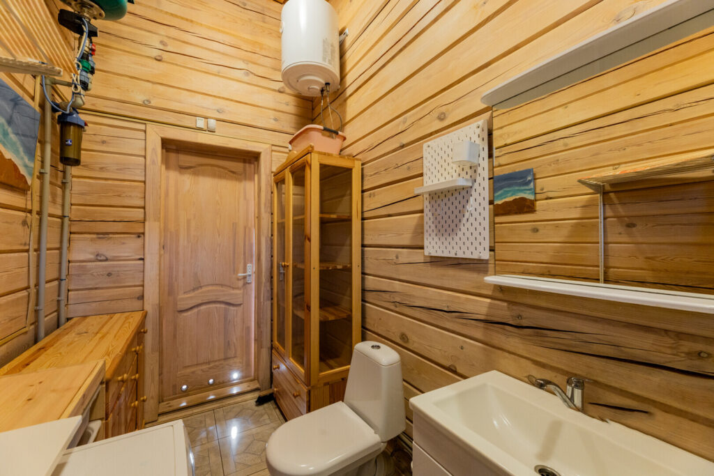 Интерьер дома оформлен в теплых древесных тонах. В просторной совмещенной кухне-гостиной с высокими потолками установлен светлый кухонный гарнитур. Здесь также имеется необходимая бытовая техника, а после покупки частично останется и мебель. В доме предусмотрены две изолированные спальни. В санузле установлена душевая кабина и бойлер. Водоснабжение организовано как от сезонного источника, так и из скважины. Отопление в доме осуществляется с использованием газа.