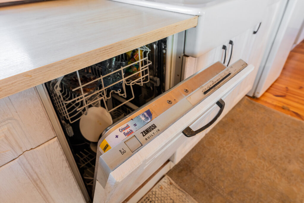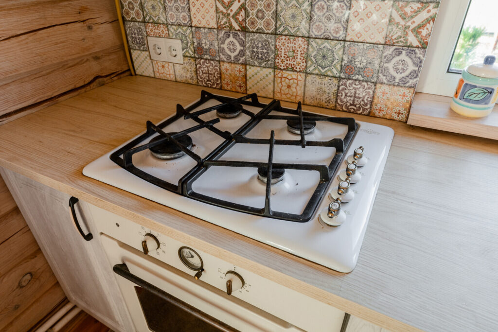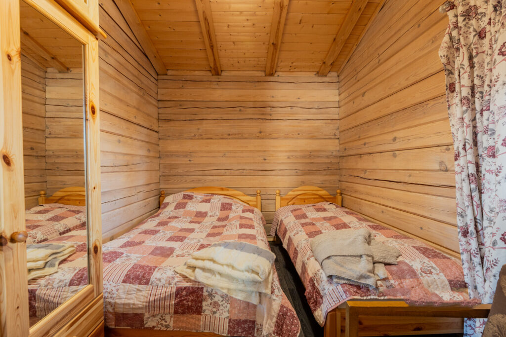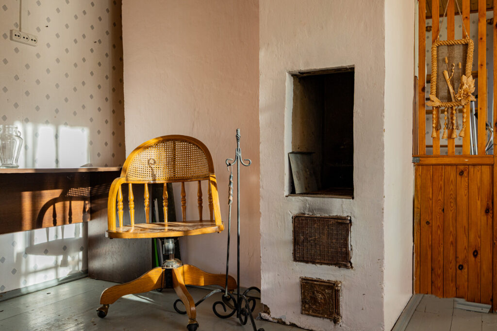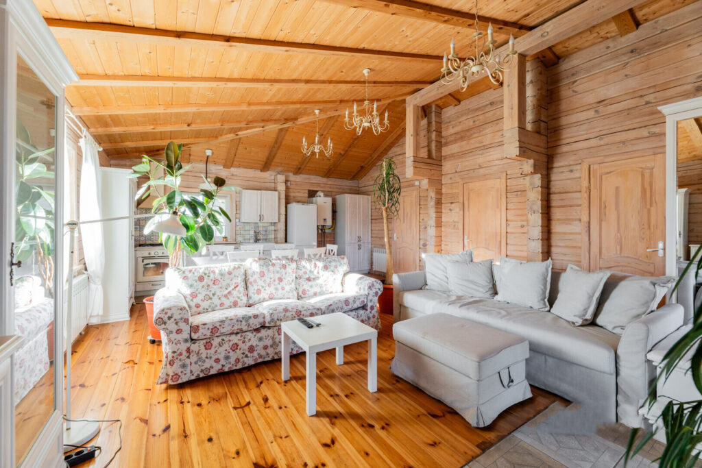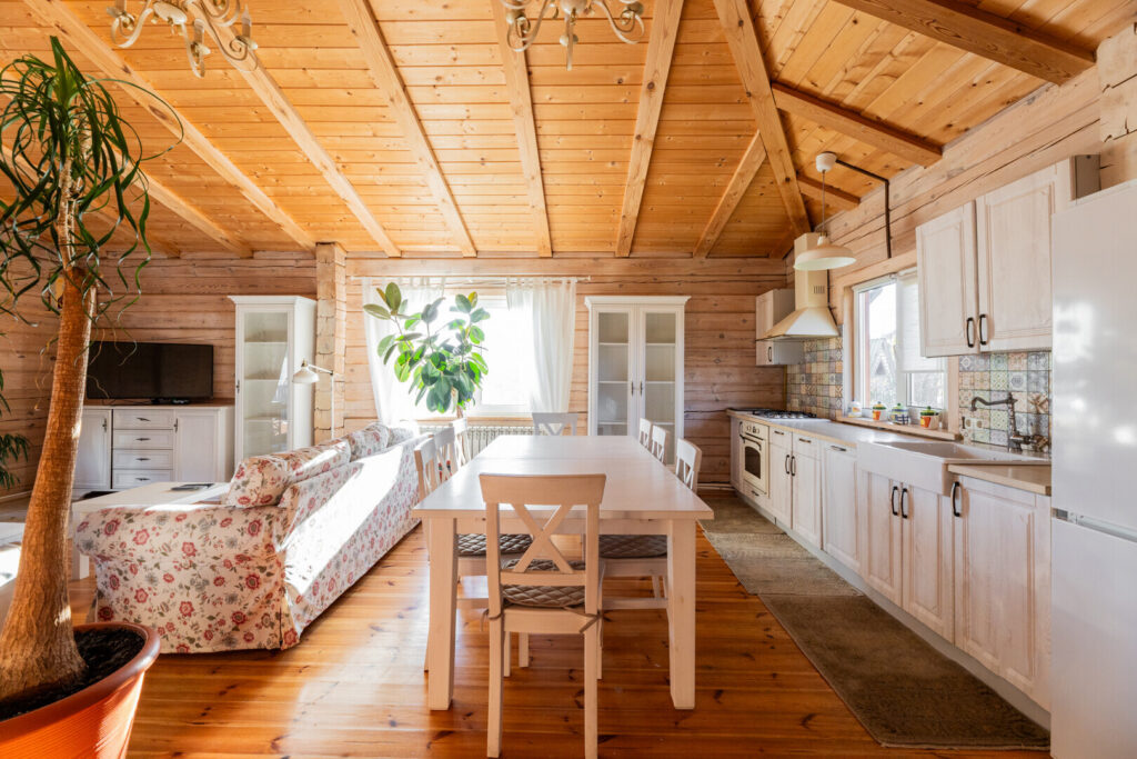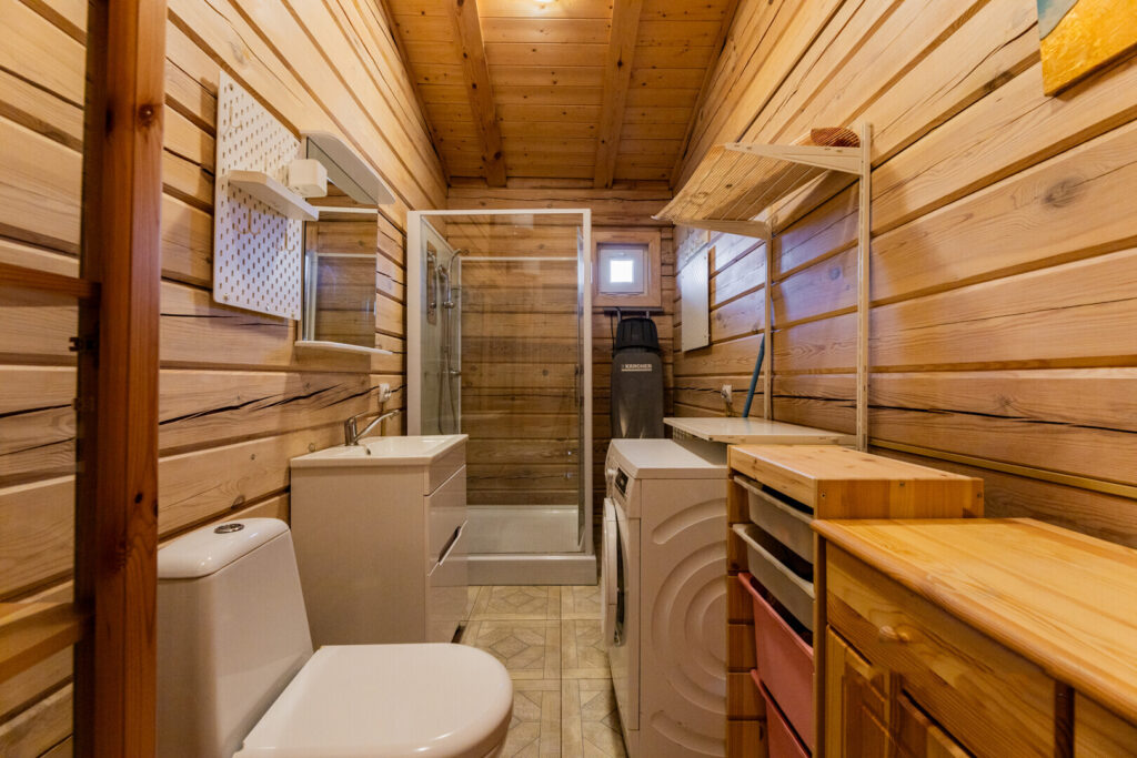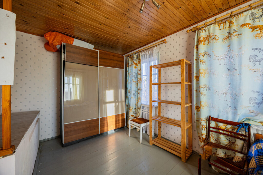 Интерьер дома оформлен в теплых древесных тонах. В просторной совмещенной кухне-гостиной с высокими потолками установлен светлый кухонный гарнитур. Здесь также имеется необходимая бытовая техника, а после покупки частично останется и мебель. В доме предусмотрены две изолированные спальни. В санузле установлена душевая кабина и бойлер. Водоснабжение организовано как от сезонного источника, так и из скважины. Отопление в доме осуществляется с использованием газа.