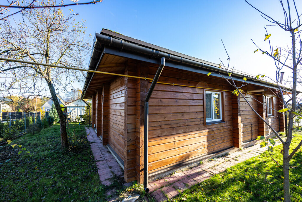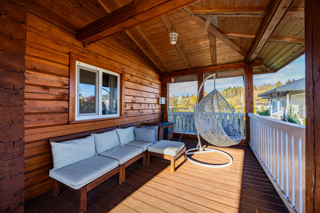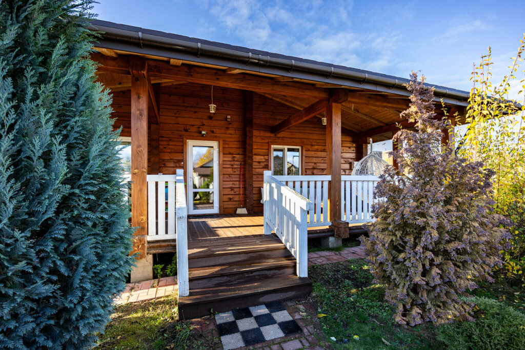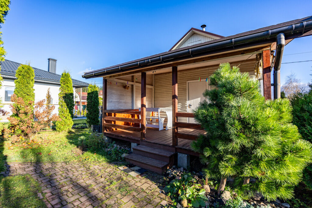 К дому прилегает просторная крытая терраса. Кроме того, на участке располагается гостевой дом, который поражает своей аутентичностью. Внутри него находится уютная печь, небольшая кухня и спальное место, что делает его идеальным для приема гостей. Гостевой дом также оборудован террасой.