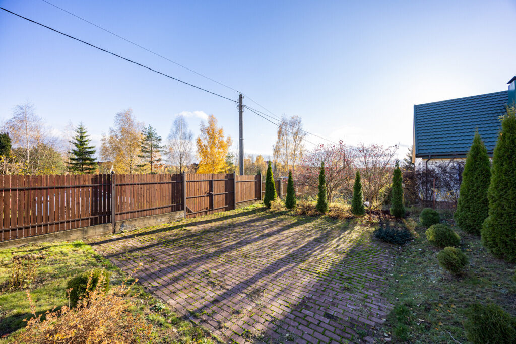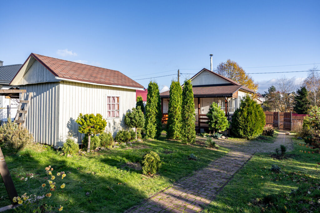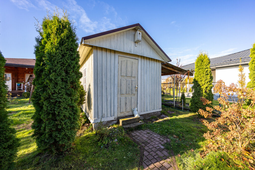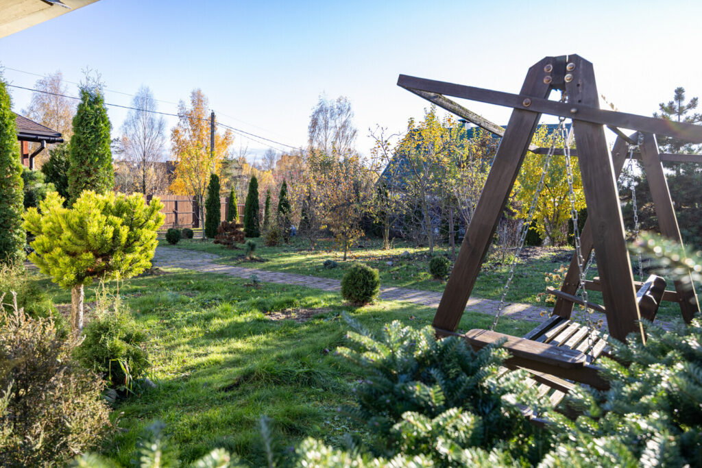 Участок, на котором расположен дом, огорожен и занимает чуть больше 11 соток. Он выглядит очень аккуратно и ухоженно: здесь растет множество зелени, установлены качели для детей, а также обустроено парковочное место для автомобилей. Для хранения хозяйственных вещей предусмотрена отдельная постройка.