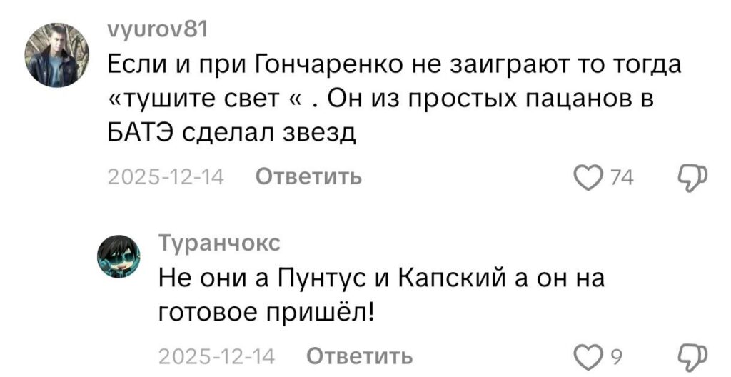 Новость о том, что Ганчаренко станет новым рулевым появилась в середине декабря и уже тогда Виктор Михайлович получил сотню комплиментов. Например, один из пользователей уверен, что именно Ганчаренко сделал из простых пацанов, играющих в БАТЭ, звезд. «Пришел на готовое», — возразил другой тиктокер.