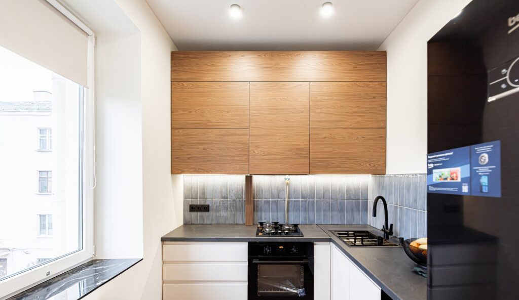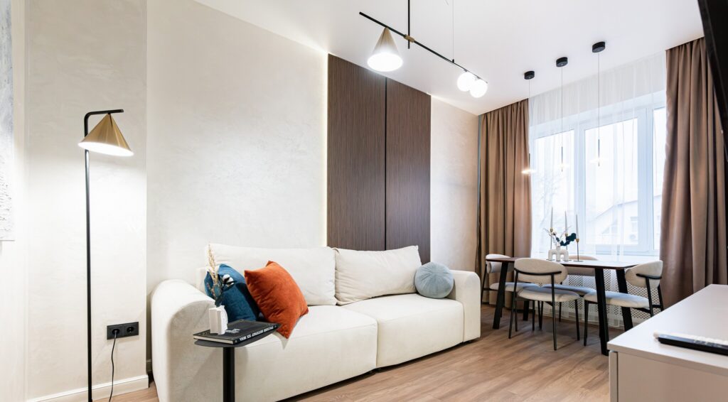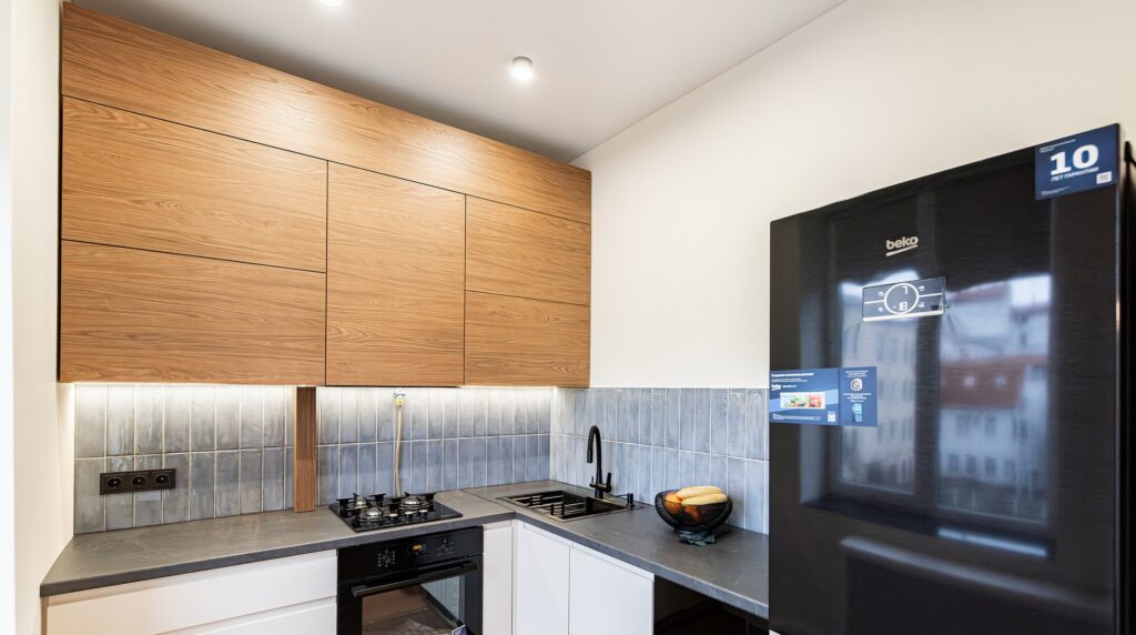 Кухня укомплектована всей необходимой современной техникой, включая духовой шкаф, варочную панель и холодильник. Важно отметить, что вся техника новая — на ней даже не сняты защитные наклейки. В целях оптимизации пространства в небольшой кухне обеденный стол со стульями был удобно размещен в гостиной. Гостиная отличается светлыми стенами и напольным покрытием, что визуально расширяет пространство. Здесь также располагается диван и телевизор.