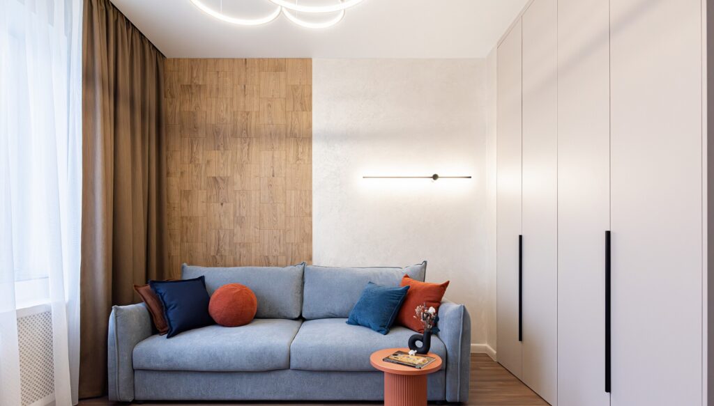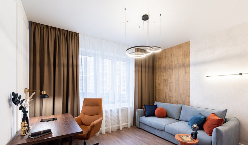 В одной из жилых комнат организован рабочий кабинет. Здесь предусмотрено рабочее место и второй диван.