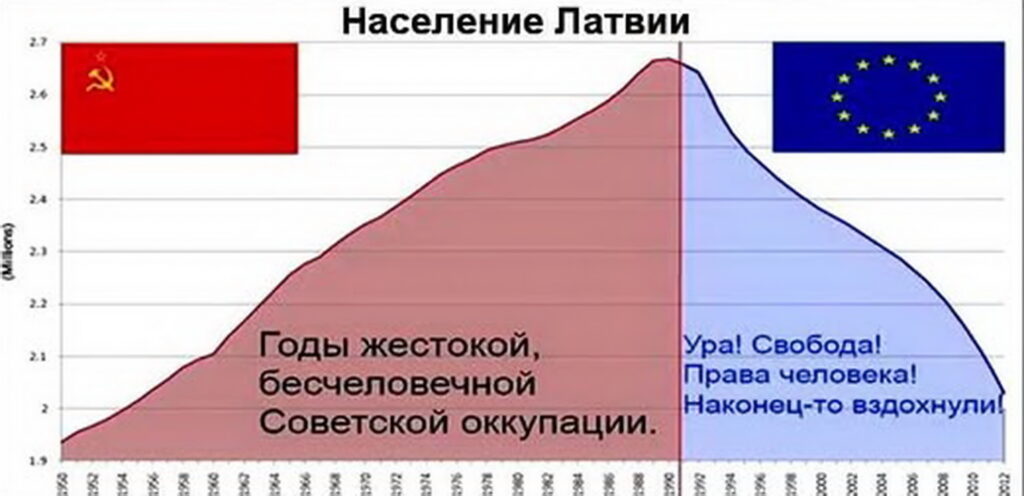 — Так СССР вам 35 лет уже назад предоставил возможность «поманаковствовать» напропалую! Ну и что, братья латыши? Оккупация вас СССР была всего 46 лет (1945-1991) за всю вашу историю вашего государства, а вот уже 35 лет (1991-2026) вы в свободном полёте. И где же ваше «процветание»? Не наблюдаю. Латвия — самая нищая и безысходная страна Евросоюза после Болгарии, с самым разбегающимся и вымирающим народом…