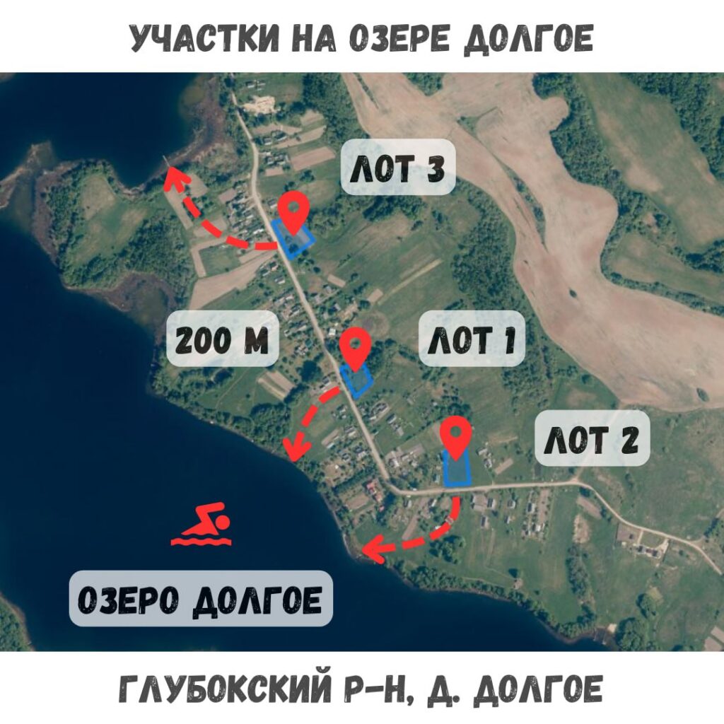 На торги выставлены три участка, расположенные в деревне Долгое на улице Озёрной. Каждый из них находится рядом с озером Долгое.