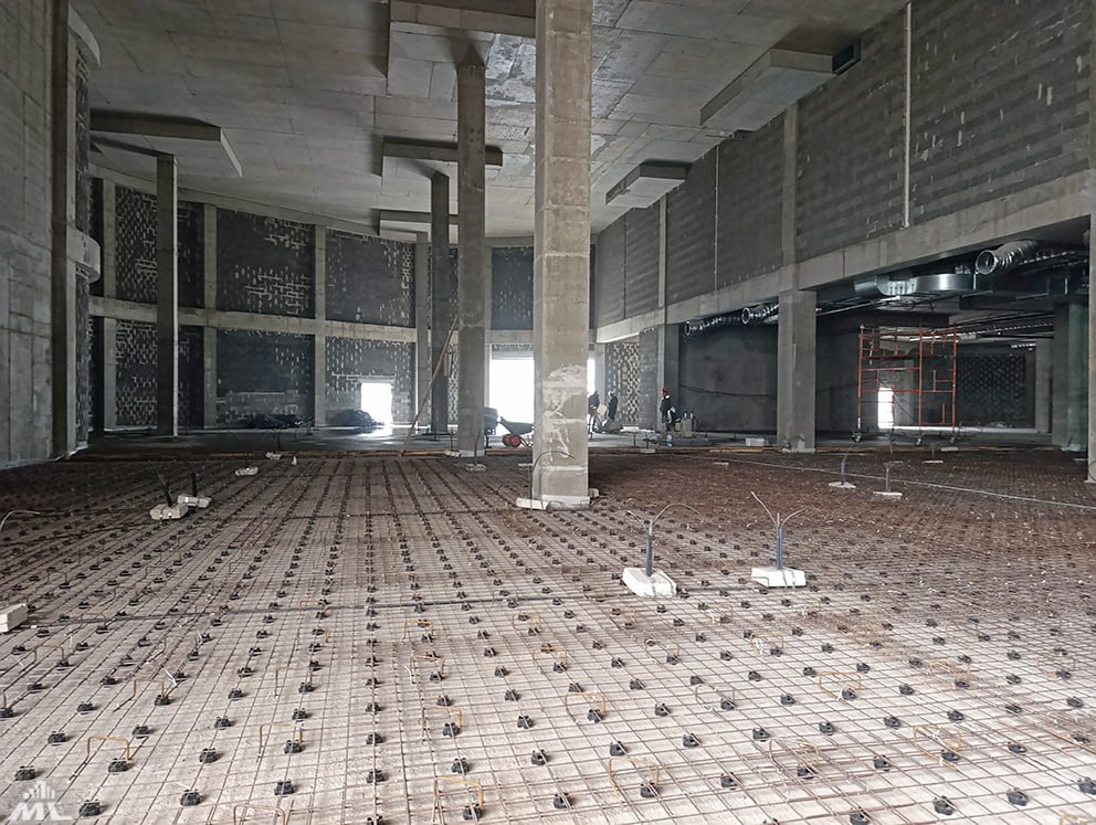 На объекте завершается возведение каркаса здания, активно утепляется фасад, а на южной стороне уже ведутся кровельные работы. К концу месяца планируется монтаж витражных систем, чтобы закрыть контур первых трёх этажей, а также устройство вентфасада.