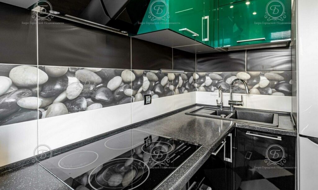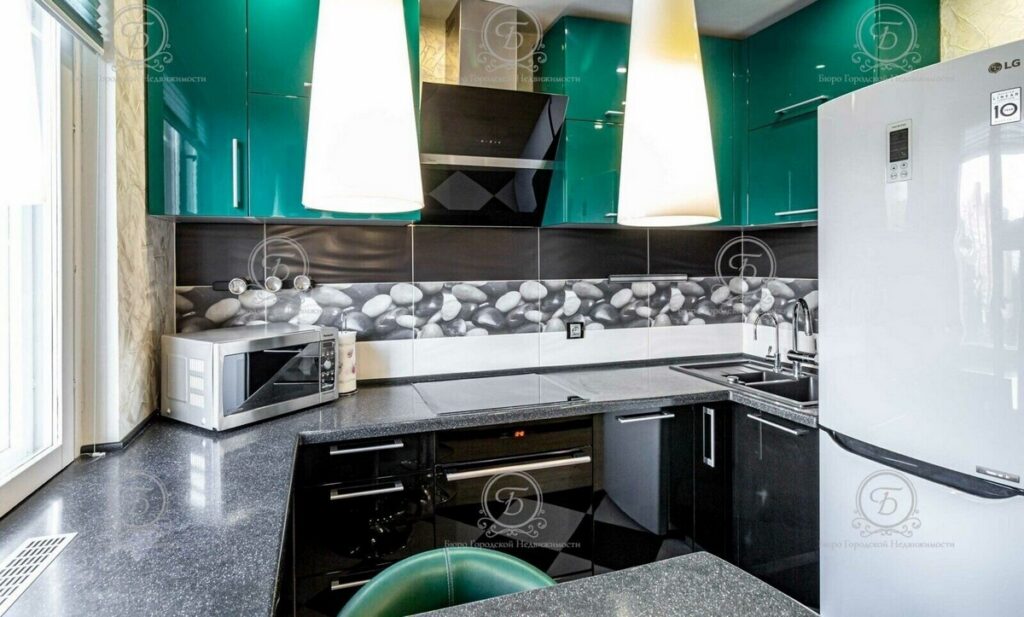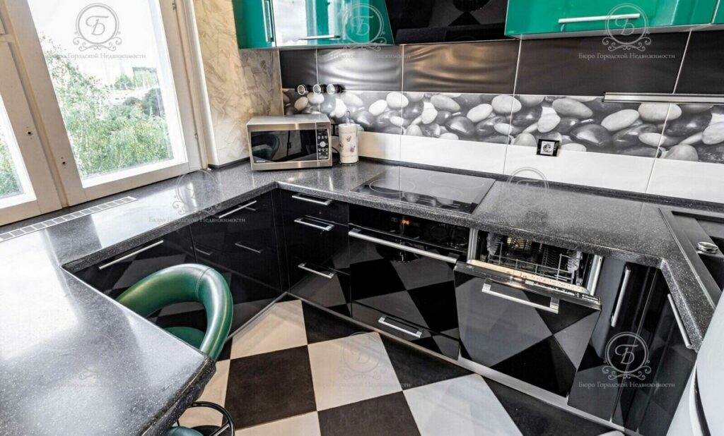 Современная кухня грамотно зонирована: установлены эргономичный гарнитур с глянцевыми фасадами, барная стойка, телевизор, встроенная техника (холодильник, варочная поверхность, духовой шкаф, вытяжка, посудомоечная машина, микроволновка, очистка воды).