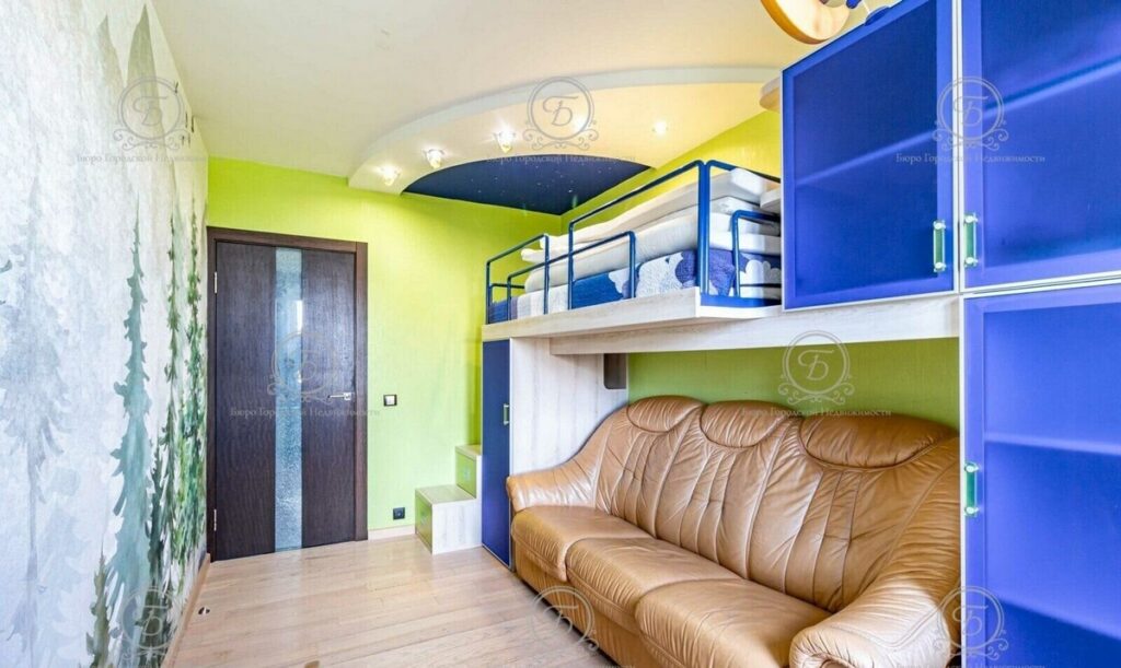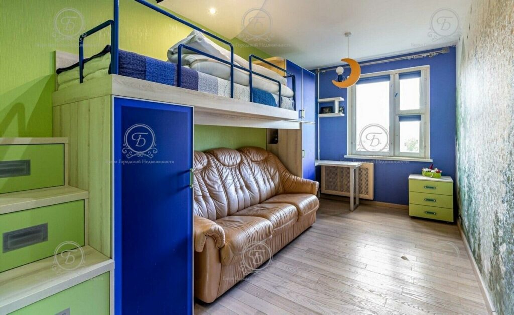 В детской комнате есть раскладной диван, письменный стол, двухярусная кровать с множеством мест хранения.