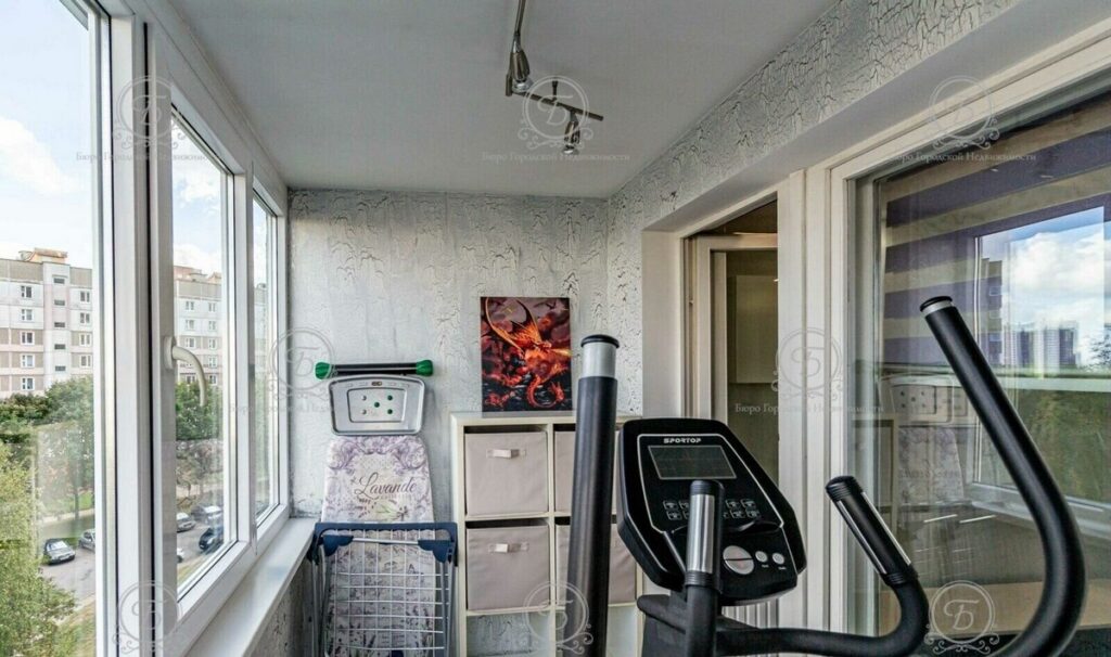 Из гостиной есть выход на застекленную лоджию, где находятся дополнительные системы хранения, а также элептический тренажер.