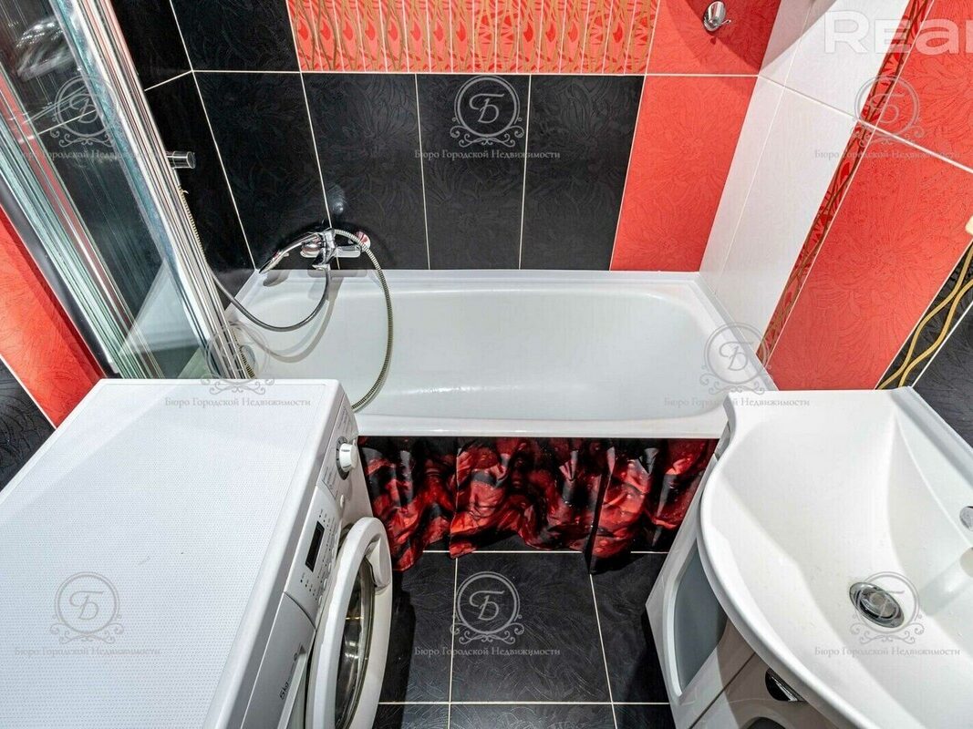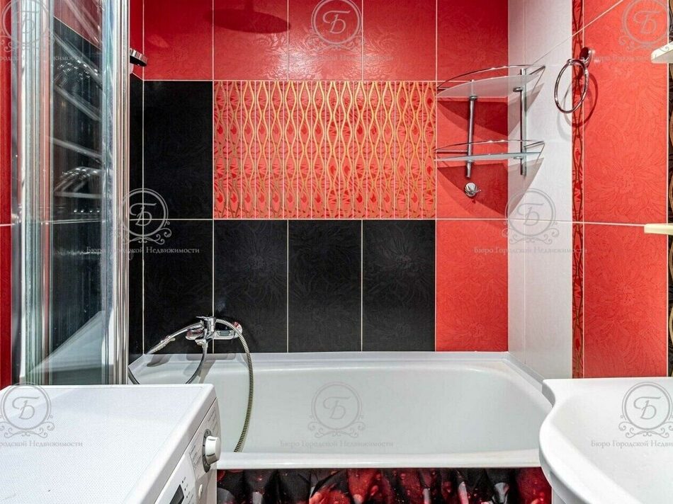 Санузел раздельный, в современном кафеле, оснащен ванной, стиральной машиной и всей необходимой сантехникой.