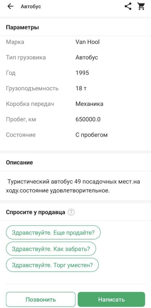 Что еще известно про предложение: грузоподъемность 18 тонн, пробег около 650000.0 км, а год выпуска — 1995. Что до цены? Она составляет 44 662 белорусских рублей или 15000 долларов. Кстати, у этого же продавца имеется еще один автобус этой же марки, только 2000 года выпуска.