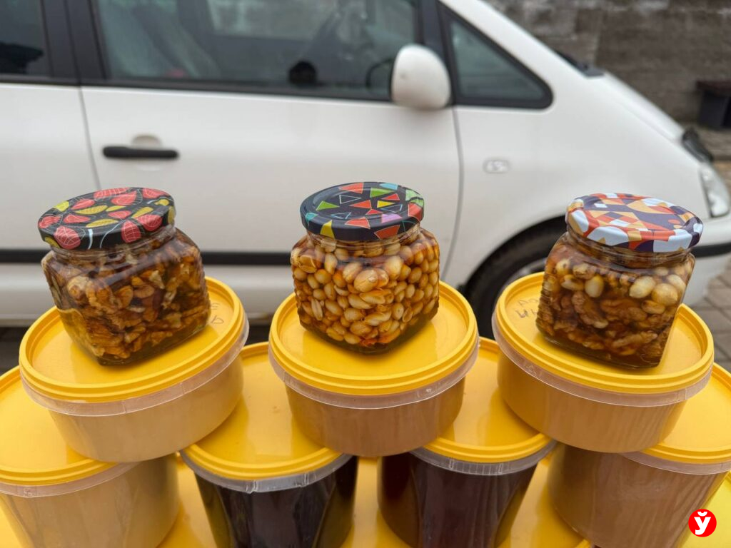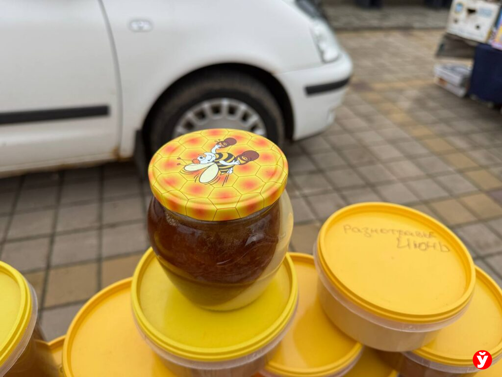 Мёд в красивой стеклянной банке (15 руб. за 0.5 л) или мёд с орехами (15 руб.) — классический и беспроигрышный вариант.