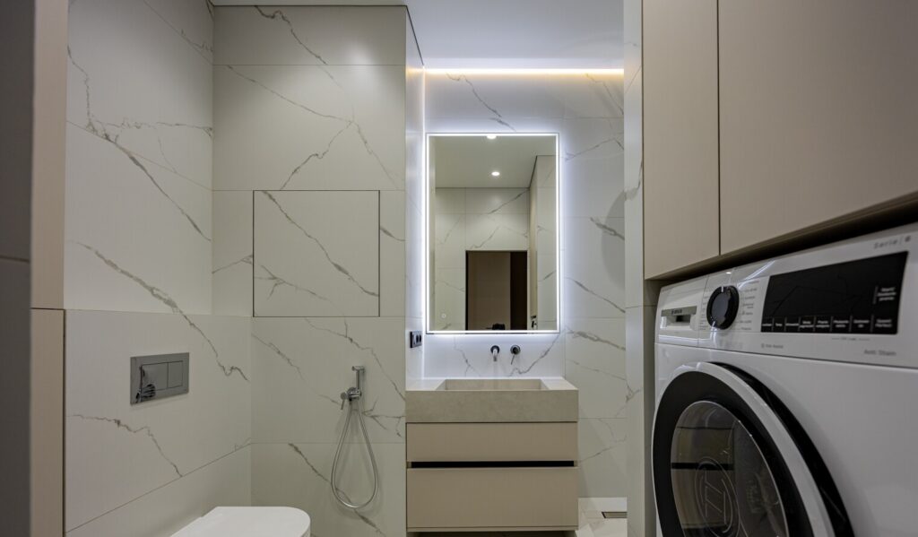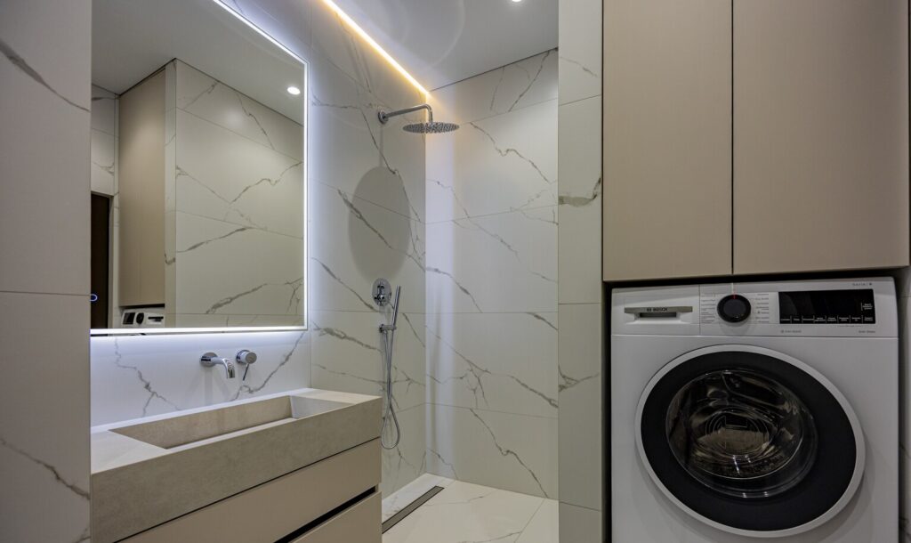 Санузел также выполнен с использованием итальянской плитки и натурального камня, а сантехника скрытого монтажа относится к премиальному классу. Здесь также имеется стиральная машина и теплые полы.