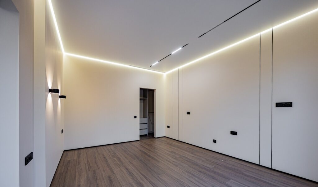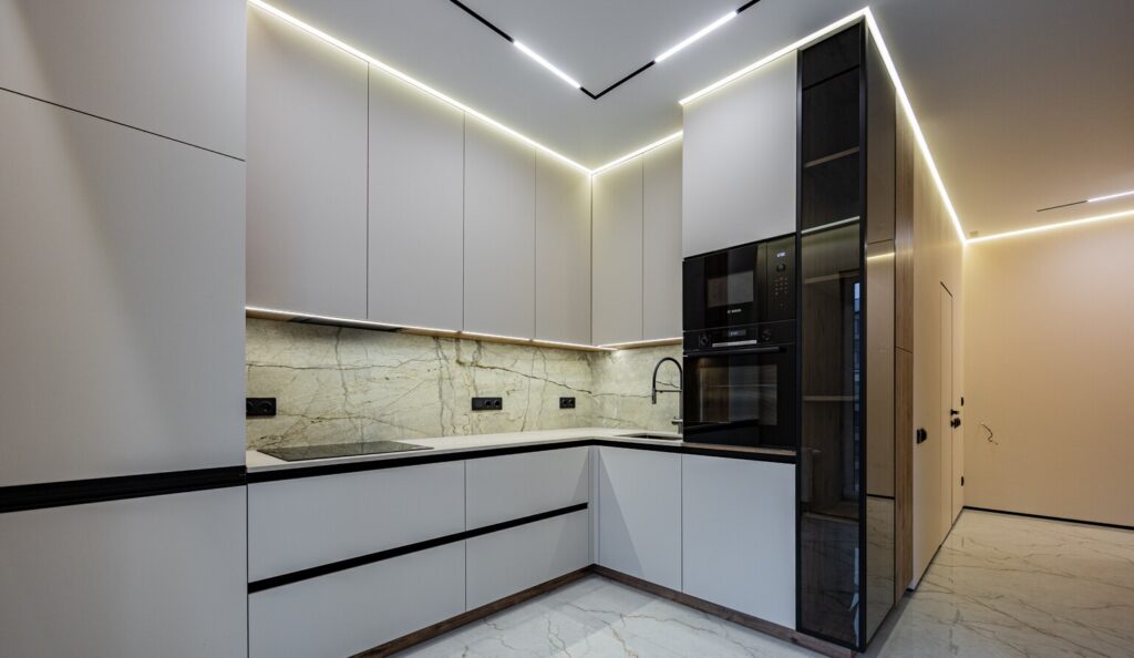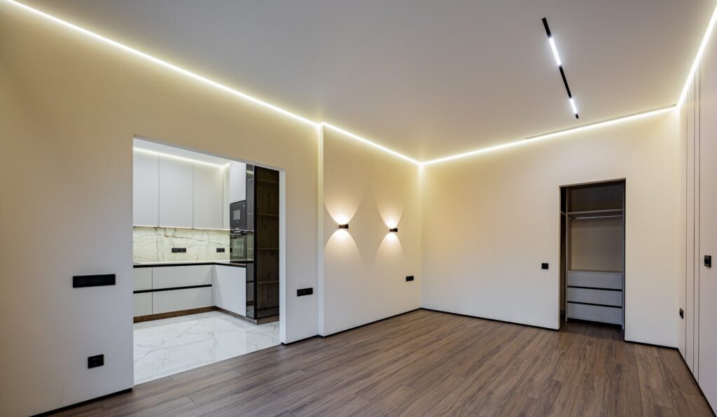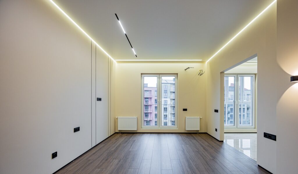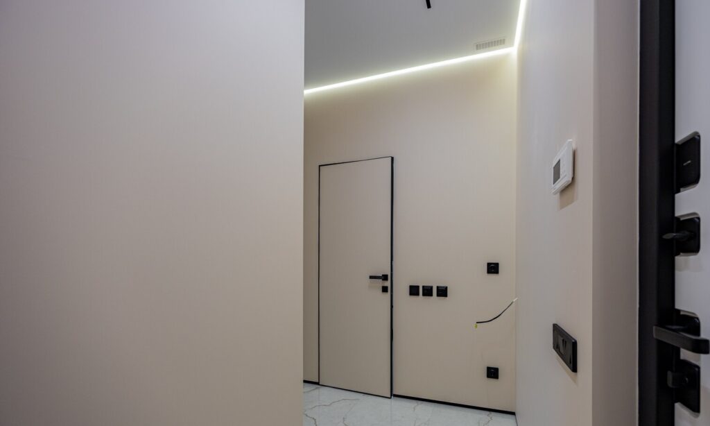 Внутреннее оформление квартиры выполнено с использованием высококачественных материалов. В коридоре и кухне-гостиной уложена итальянская плитка, что не только добавляет эстетическую привлекательность, но и обеспечивает практичность в уходе. Стены квартиры аккуратно выровнены и окрашены декоративной краской, что придает помещению современный вид. Потолок украшен теневым профилем и оригинальным освещением, что создает уютную атмосферу.