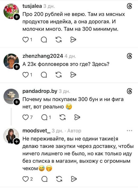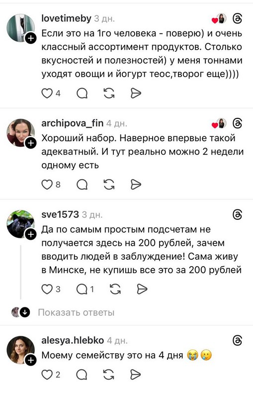 Публикацию активно начали обсуждать пользователи. Скептики пытаются вычислить стоимость каждого грамма и спорят, реально ли растянуть такой набор продуктов на две недели. Прагматики делятся своими лайфхаками по экономии, а любопытные сравнивают чек со своим.
