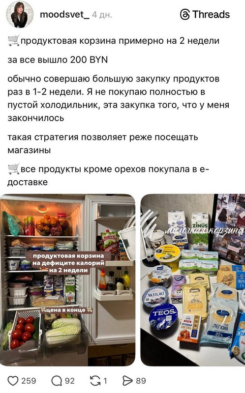 «За все вышло 200 BYN, обычно совершаю большую закупку продуктов раз в 1-2 недели», – написала она.