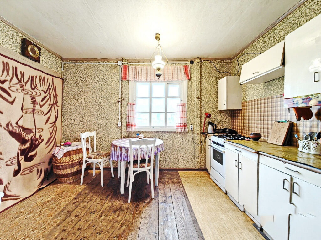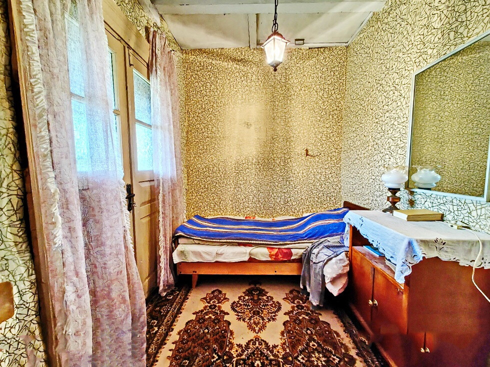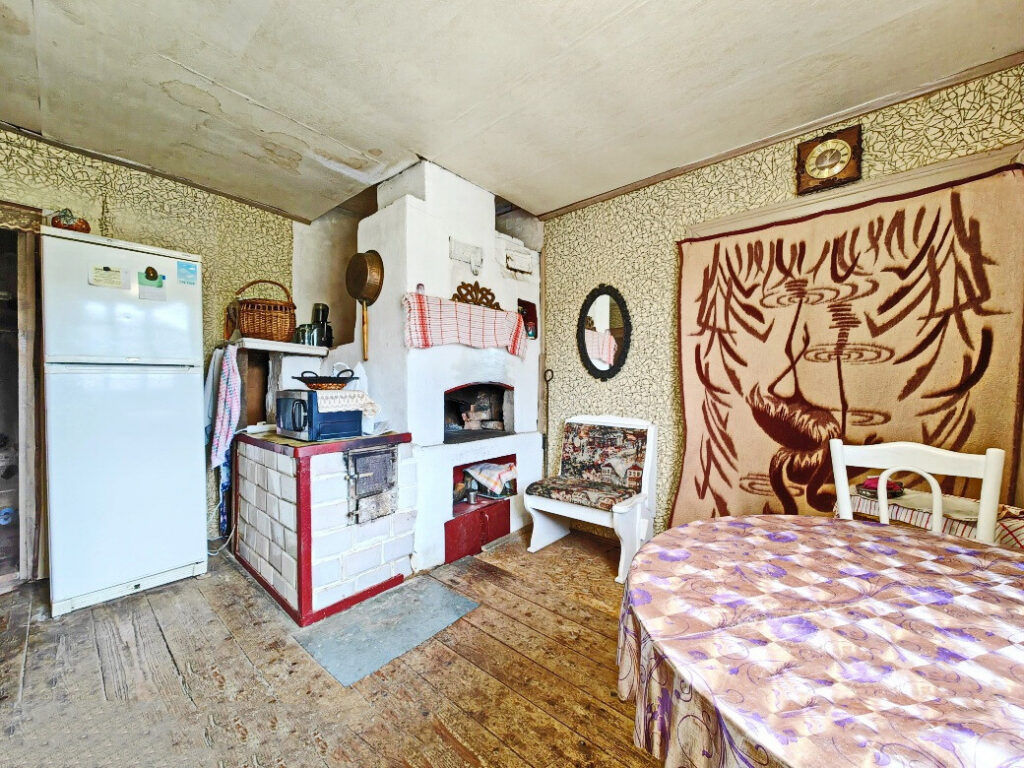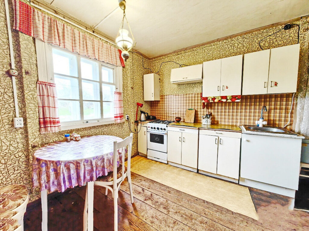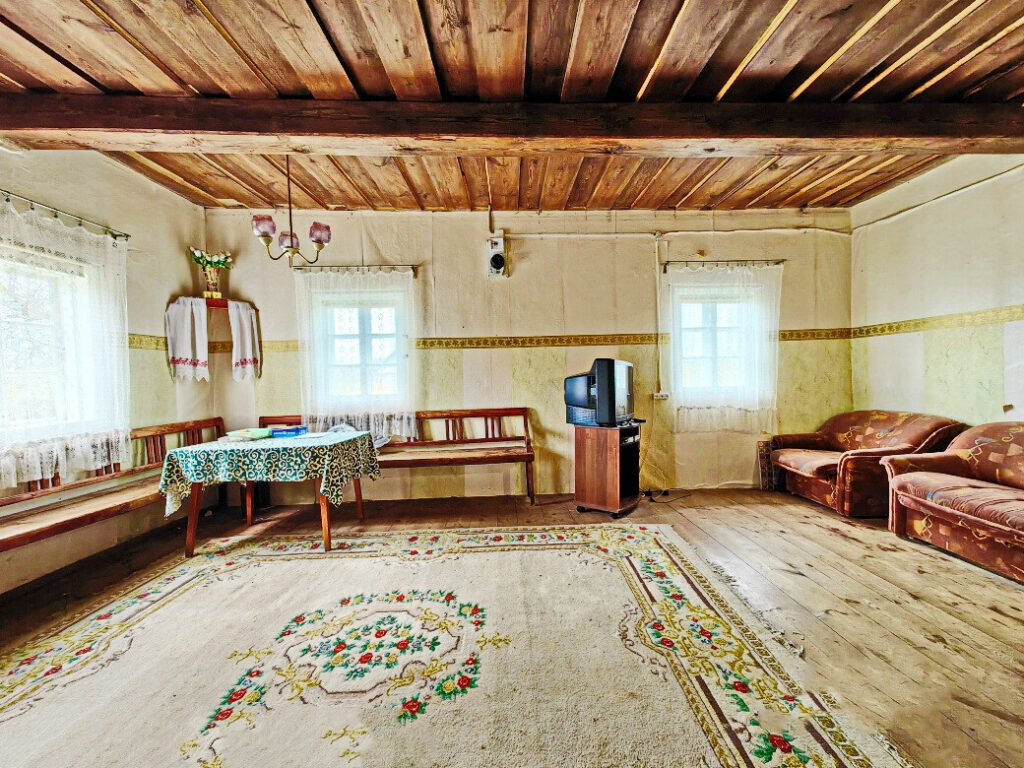 Внутри дом сохранил аутентичную атмосферу традиционного деревенского жилья: полы выполнены из массивных широких досок, а потолок — деревянный. Внутреннее убранство включает лавки у стола и «франки на вокнах», что добавляет особый колорит. Обои на стенах хоть и староваты, но не требуют срочной замены, и в целом дом выглядит довольно уютно. Высокие трехметровые потолки создают удивительное ощущение простора, несмотря на скромную общую площадь в 57 квадратных метров.