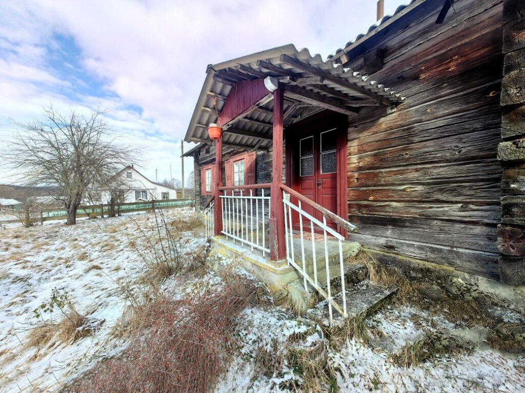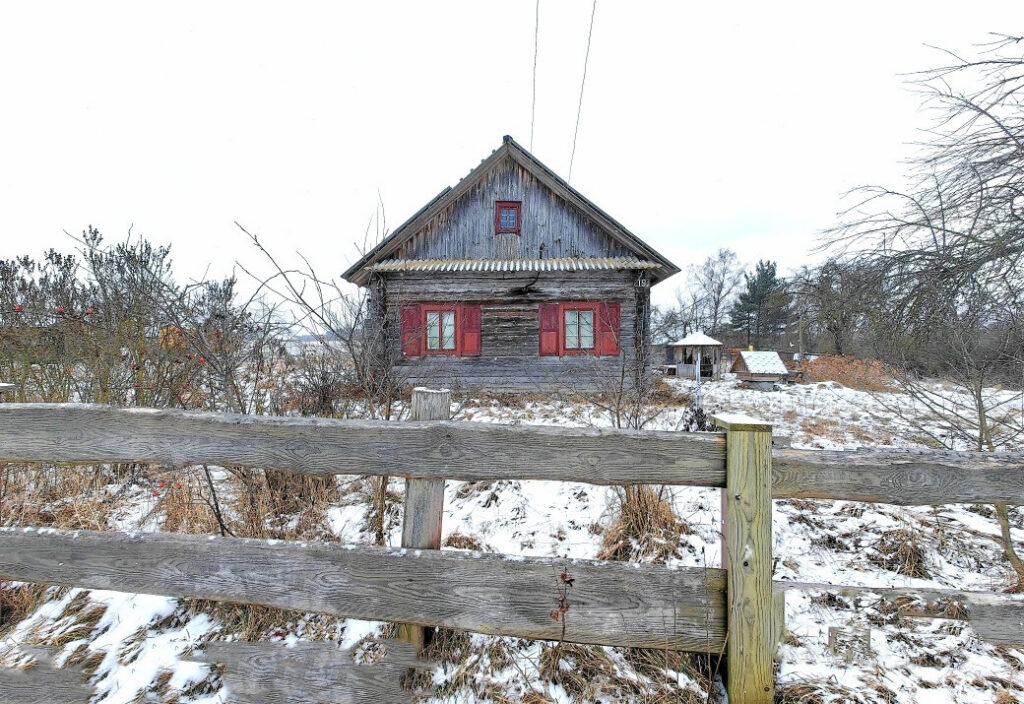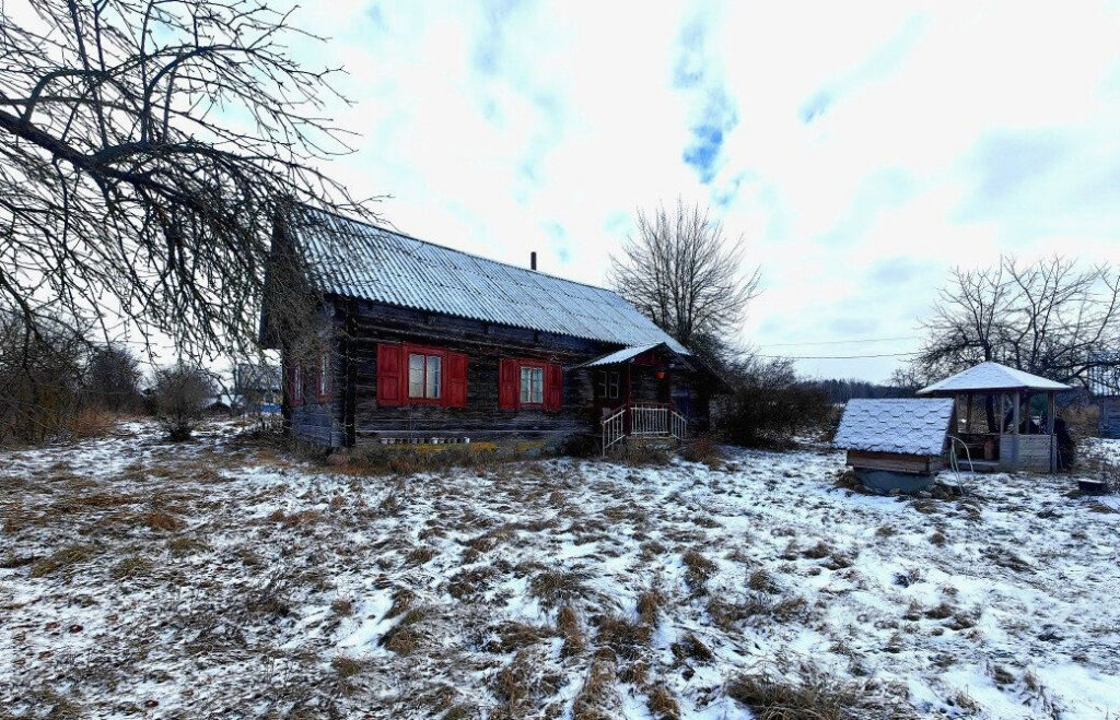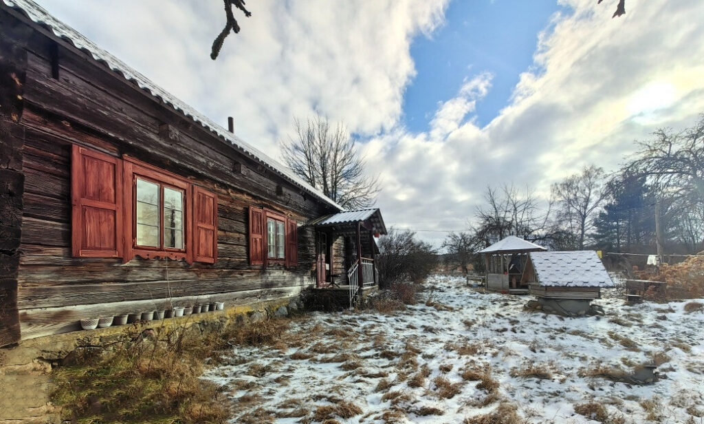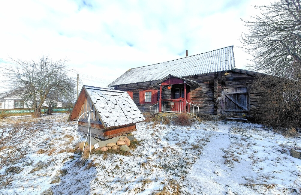 Данный дом находится в живописной деревне Рудники (Воложинский район), и его легко найти благодаря характерным ставням на окнах бордового цвета. Постройка выполнена основательно: дом стоит на высоком бетонном фундаменте, что придает ему надежность и устойчивость. Сруб дома выполнен из тесанных бревен. Внешняя обшивка отсутствует. Несмотря на то что дом был построен в 1950-х годах, он выглядит довольно бодро и привлекательно. В объявлении упоминается, что в 1993 году он был реконструирован, что дало ему второе дыхание. Тем не менее, судя по фотографиям, крыше следует уделить внимание — требуется небольшая подлатака шиферного покрытия.