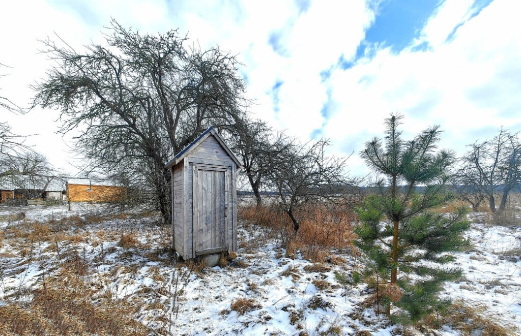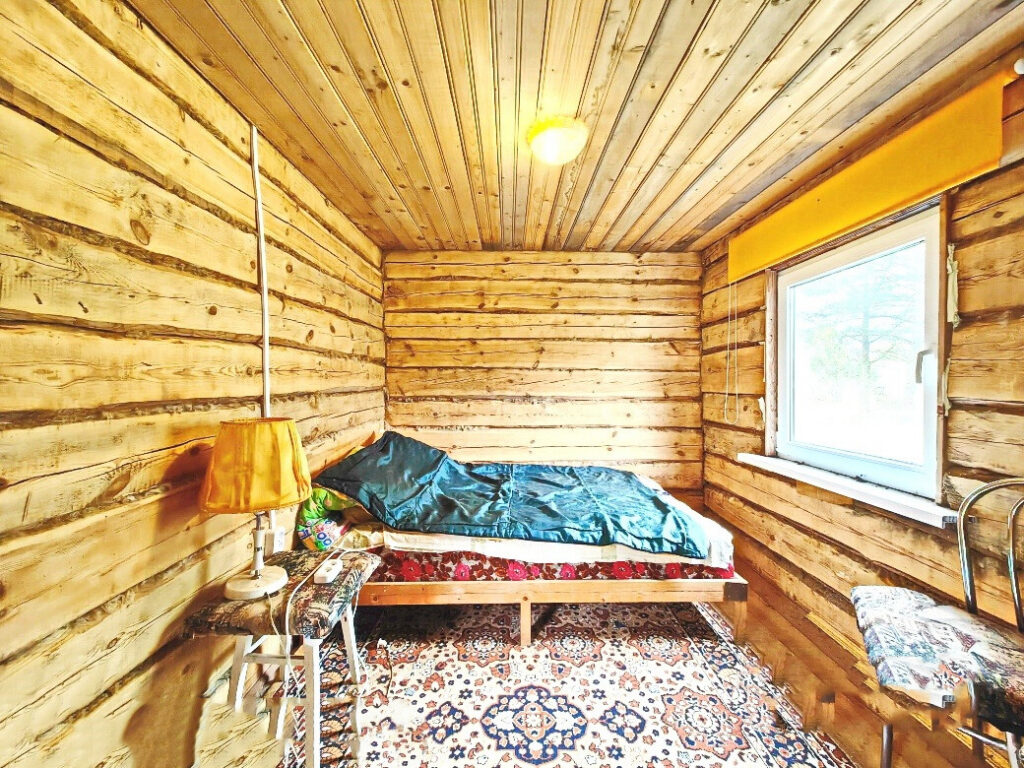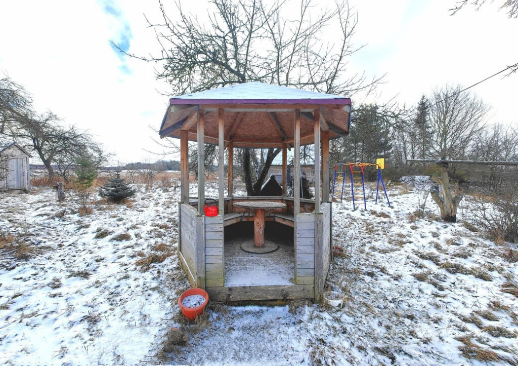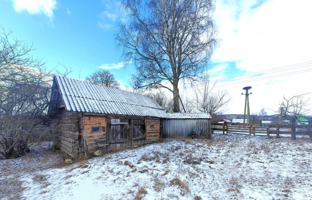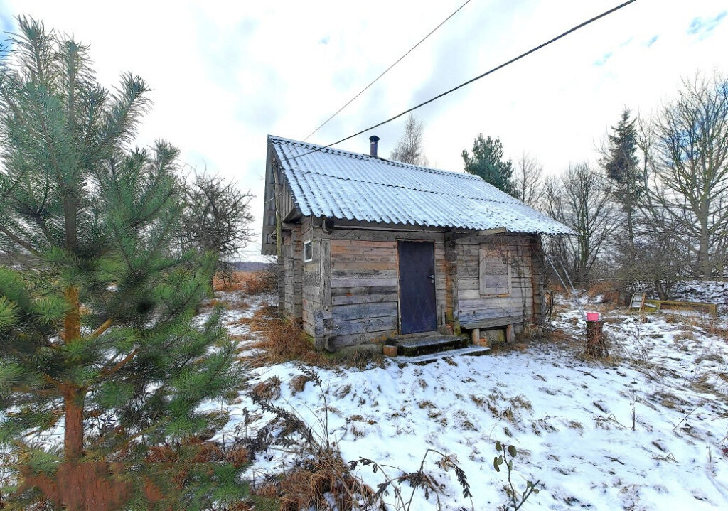 Данный дом находится в живописной деревне Рудники (Воложинский район), и его легко найти благодаря характерным ставням на окнах бордового цвета. Постройка выполнена основательно: дом стоит на высоком бетонном фундаменте, что придает ему надежность и устойчивость. Сруб дома выполнен из тесанных бревен. Внешняя обшивка отсутствует. Несмотря на то что дом был построен в 1950-х годах, он выглядит довольно бодро и привлекательно. В объявлении упоминается, что в 1993 году он был реконструирован, что дало ему второе дыхание. Тем не менее, судя по фотографиям, крыше следует уделить внимание — требуется небольшая подлатака шиферного покрытия.