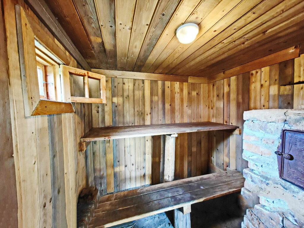 Участок, на котором расположен дом, составляет более 23 соток и огорожен, хотя забор выполнен чисто символически — на границе участка стоят вертикальные столбы и два горизонтальных бруса, что придает ему деревенскую атмосферу. Кроме самого дома и бани на участке также имеется гараж, а также старинный сухой каменный сарай, который может служить дополнительным хранилищем или местом для хранения инвентаря. Стоит этот дом на берегу реки дешевле дач в пригороде — 19 900 долларов.