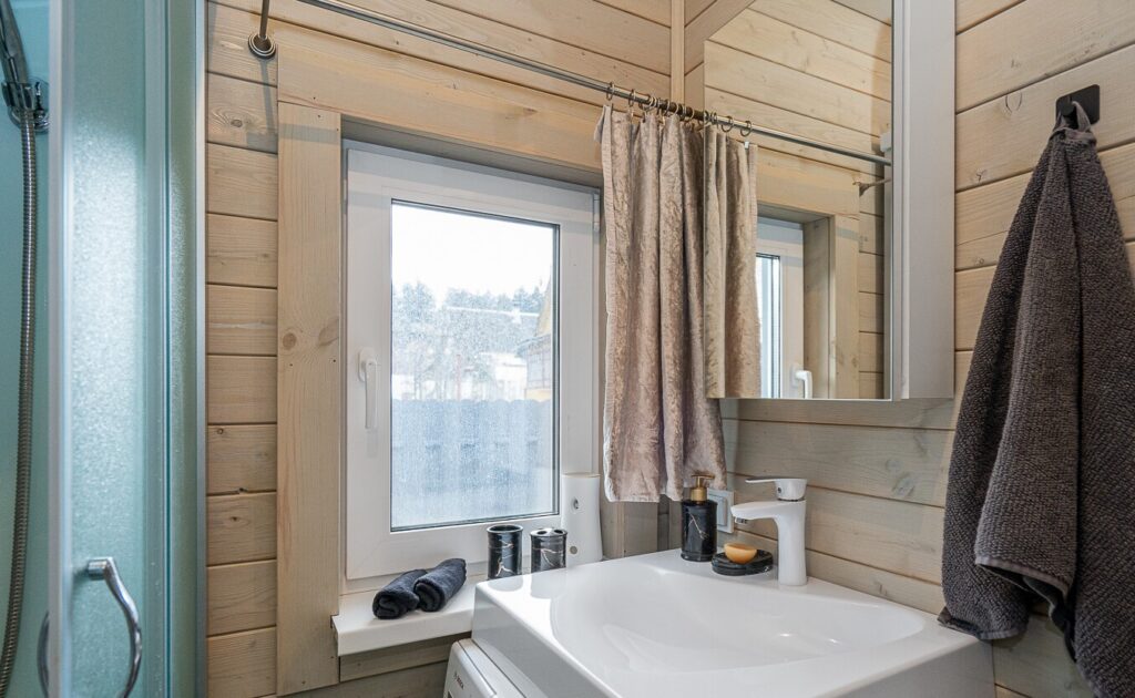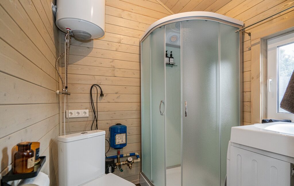 Санузел в доме совмещенный и включает в себя душевую кабину, бойлер для горячей воды и стиральную машину. В доме проведены все необходимые коммуникации, такие как водоснабжение и центральная канализация, что избавляет от лишних хлопот.