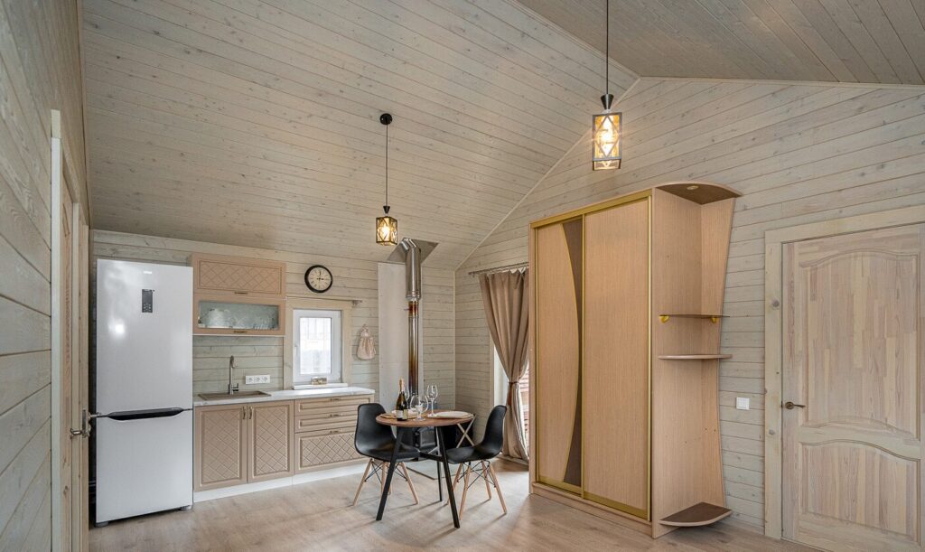 Внутреннее пространство включает в себя несколько отдельных помещений, таких как прихожая, просторная жилая комната, в которой расположены кухня и гостиная, а также отдельная спальня и санузел. Кухонный гарнитур включает в себя холодильник и электрическую плиту. В спальне установлена удобная кровать.